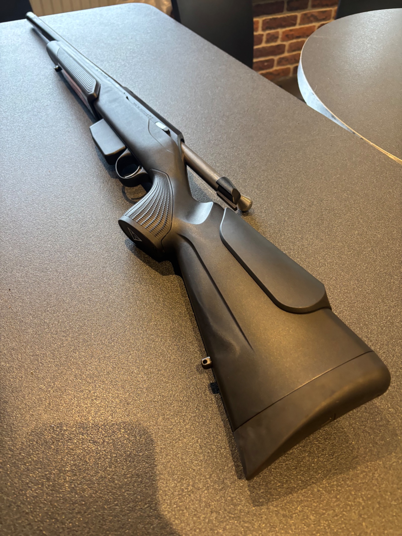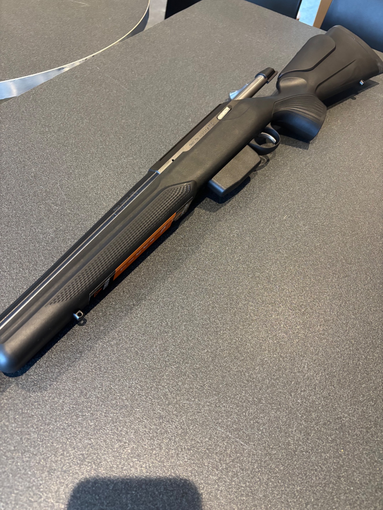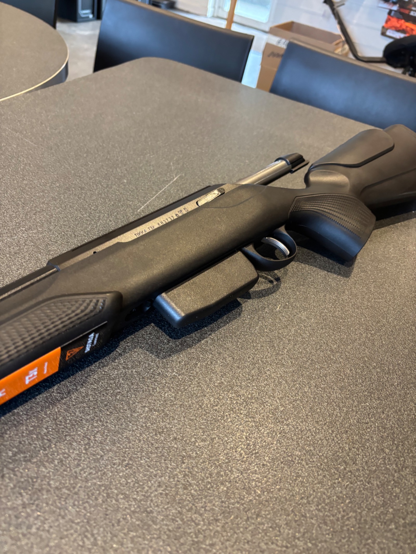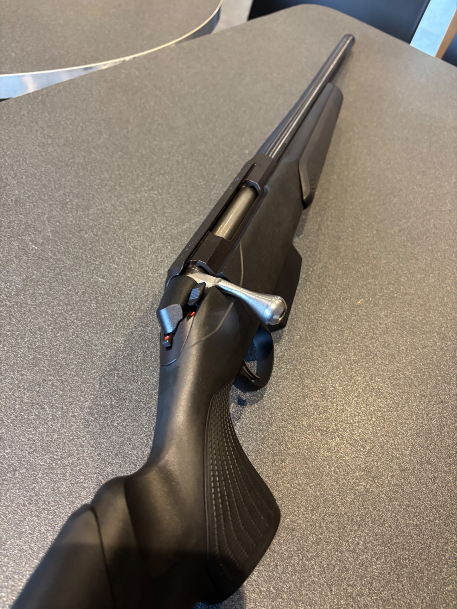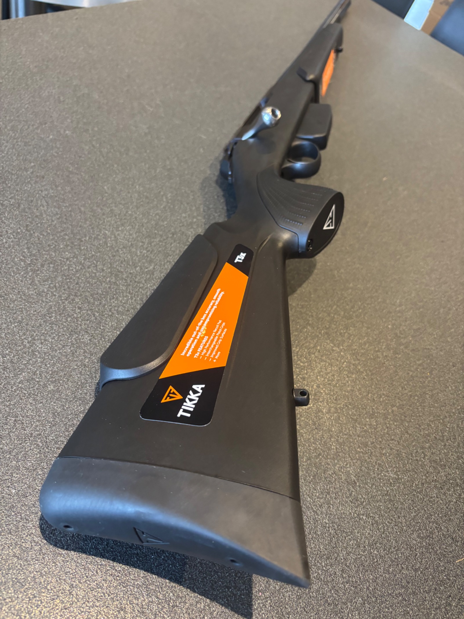 Tikka T3X varmint Black synthetic chassis Blued barrel 20” barrel 1:12 twist rate 18x1 muzzle thread Single stage trigger Two positional safety Varmint heavy barrel 5rd mag
