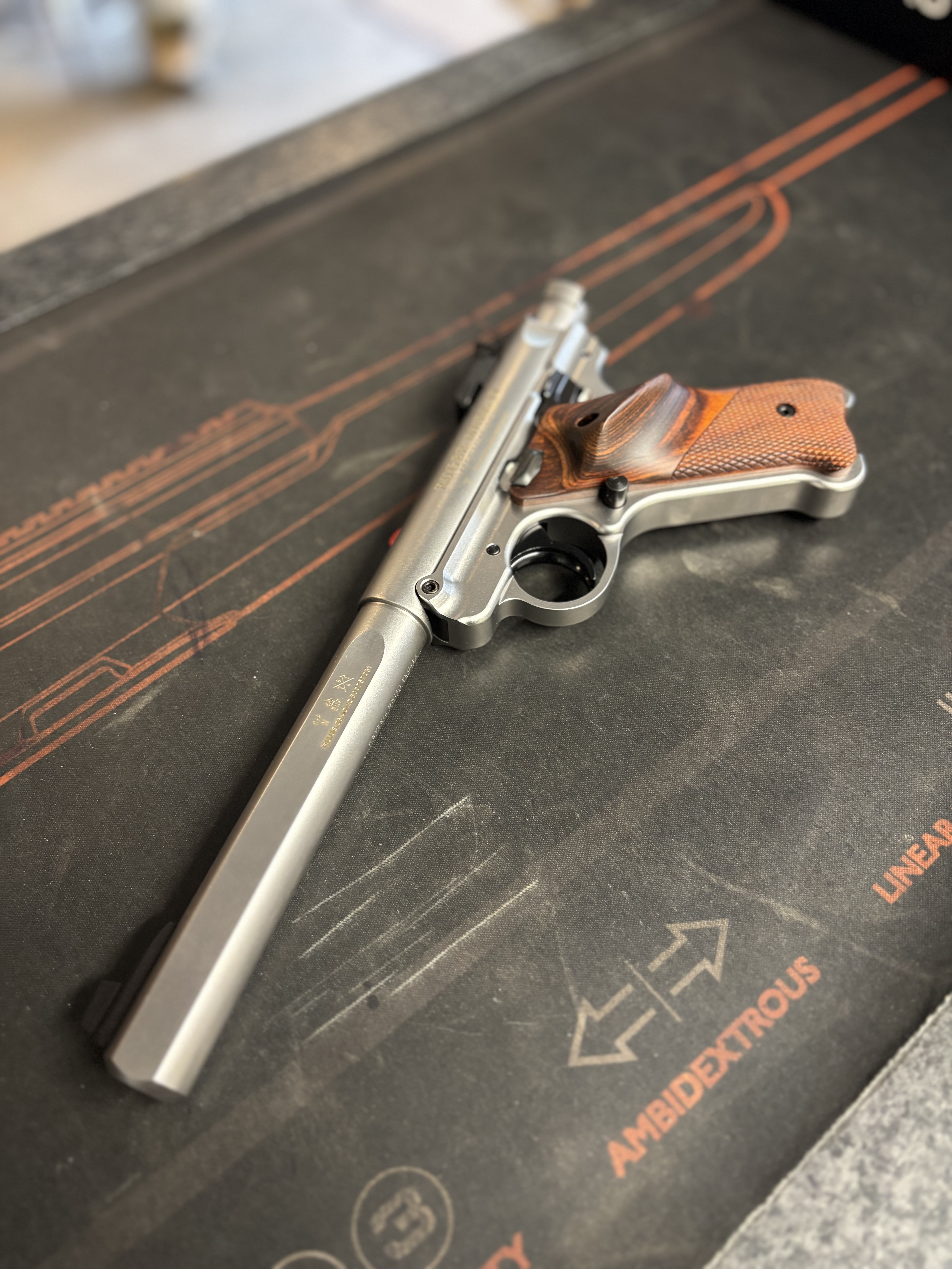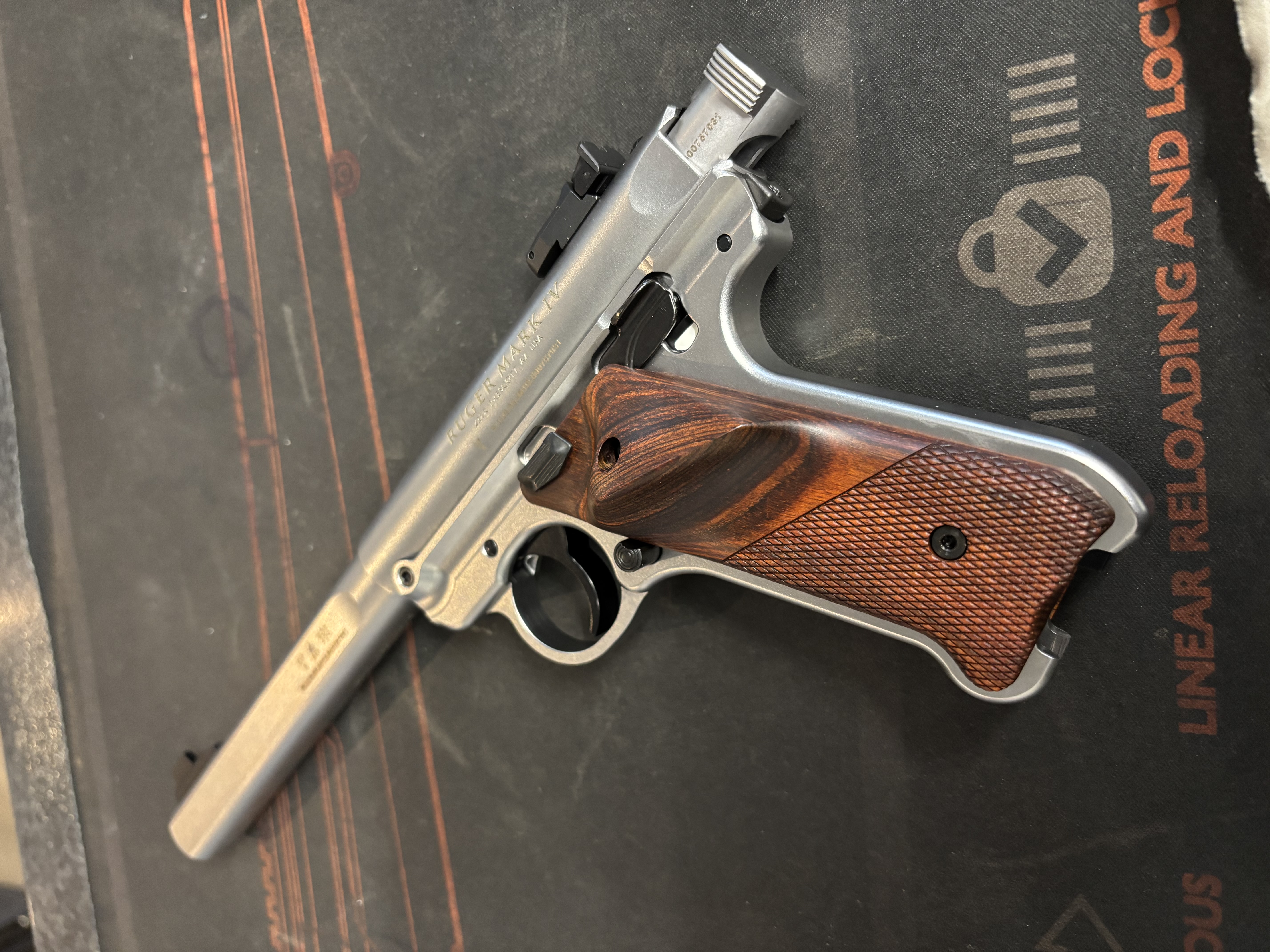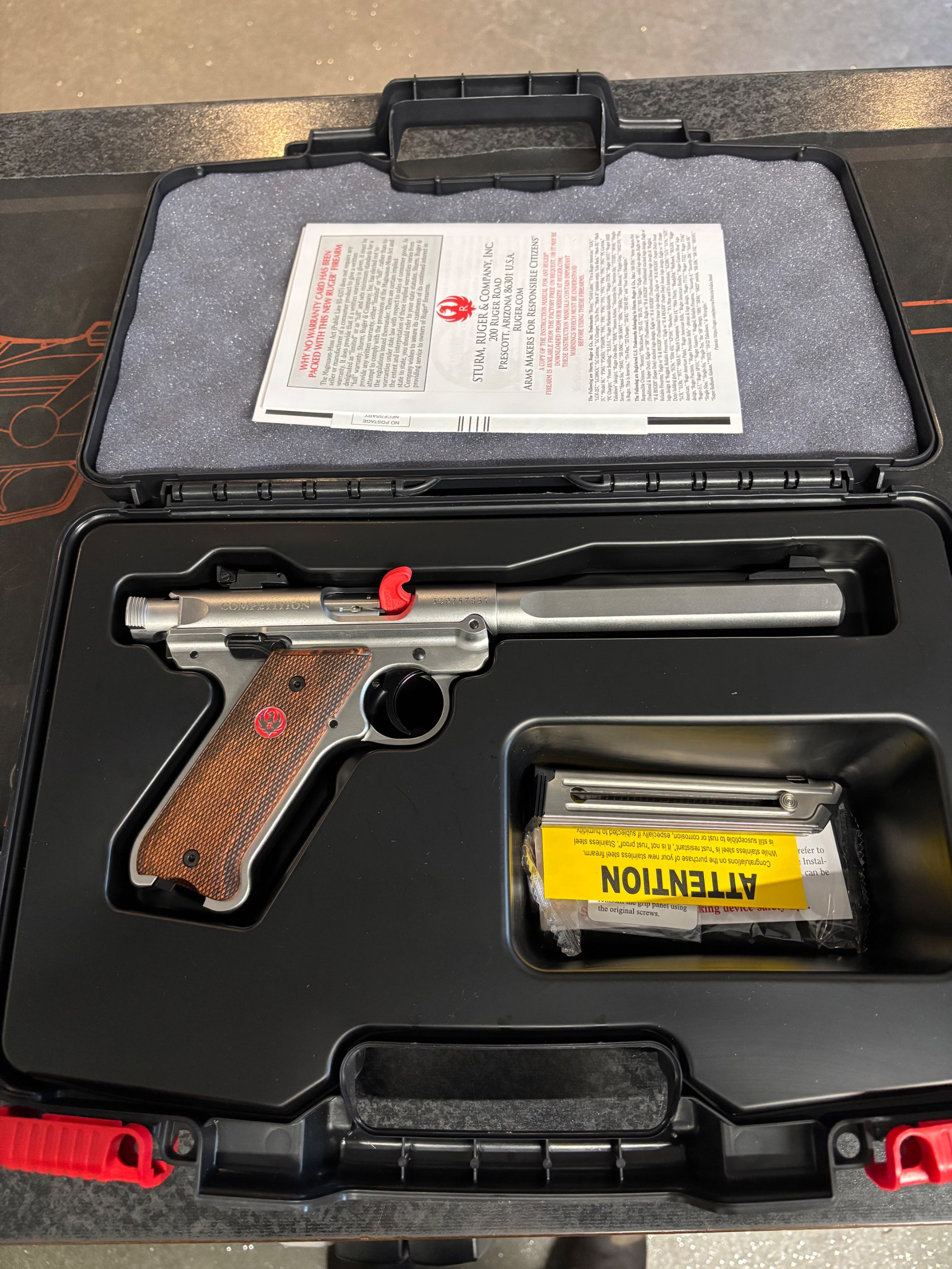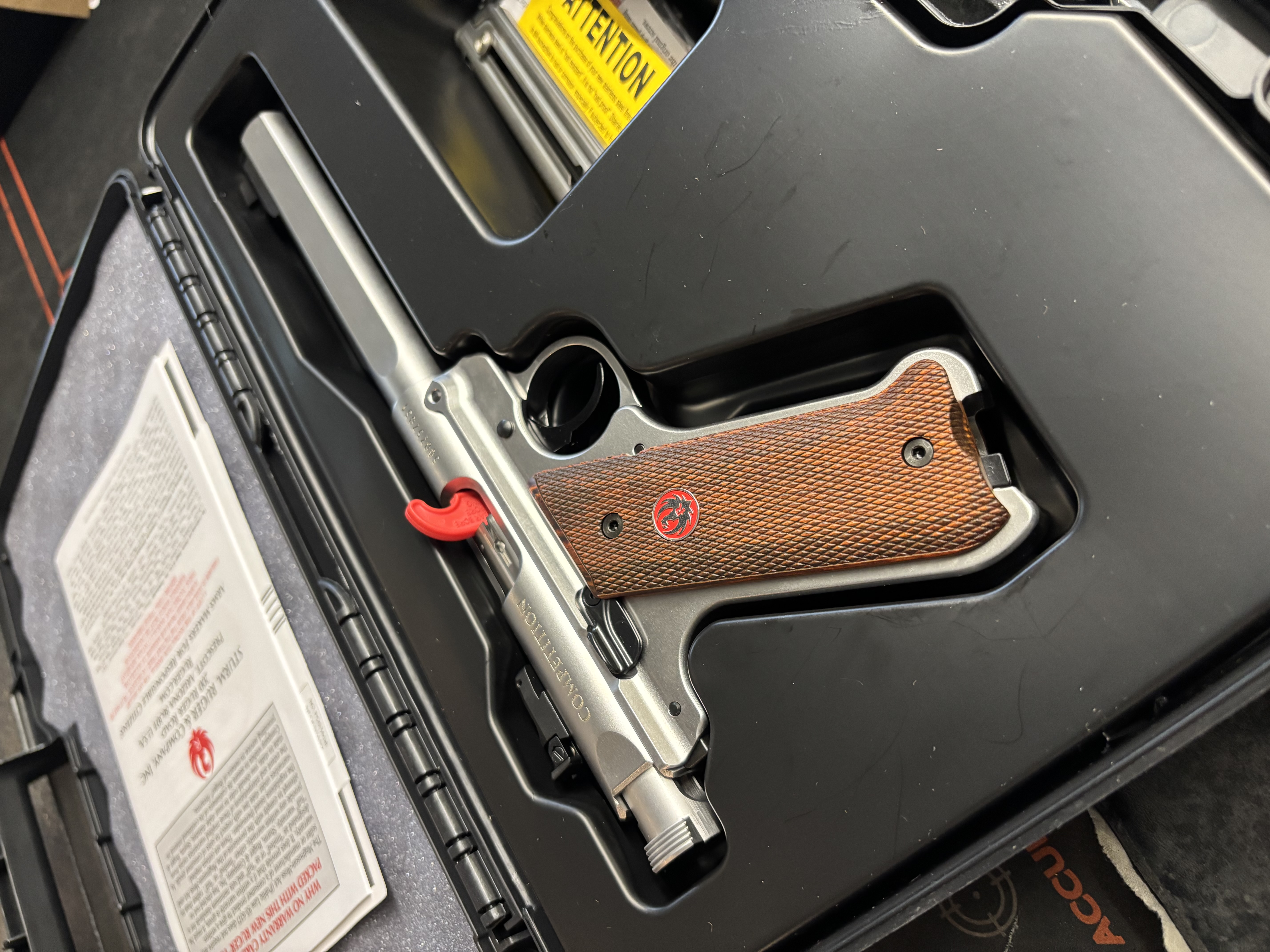 New Ruger MKIV competition .22lr X2 mags 6.8” barrel Adjustable rear sight Ruger hard case Wooden hand grips
