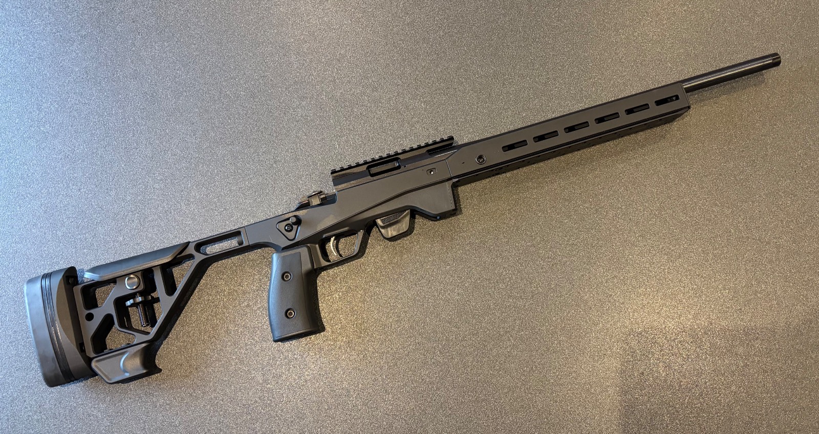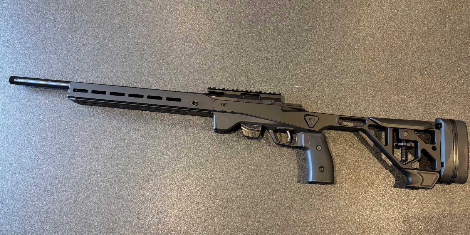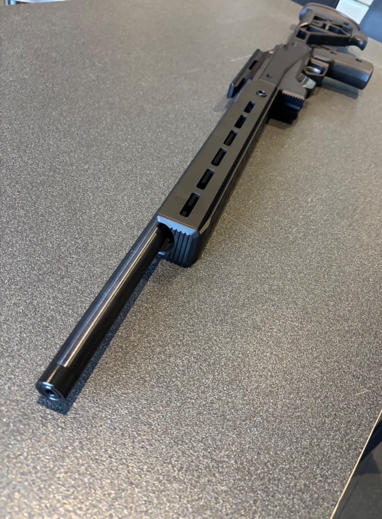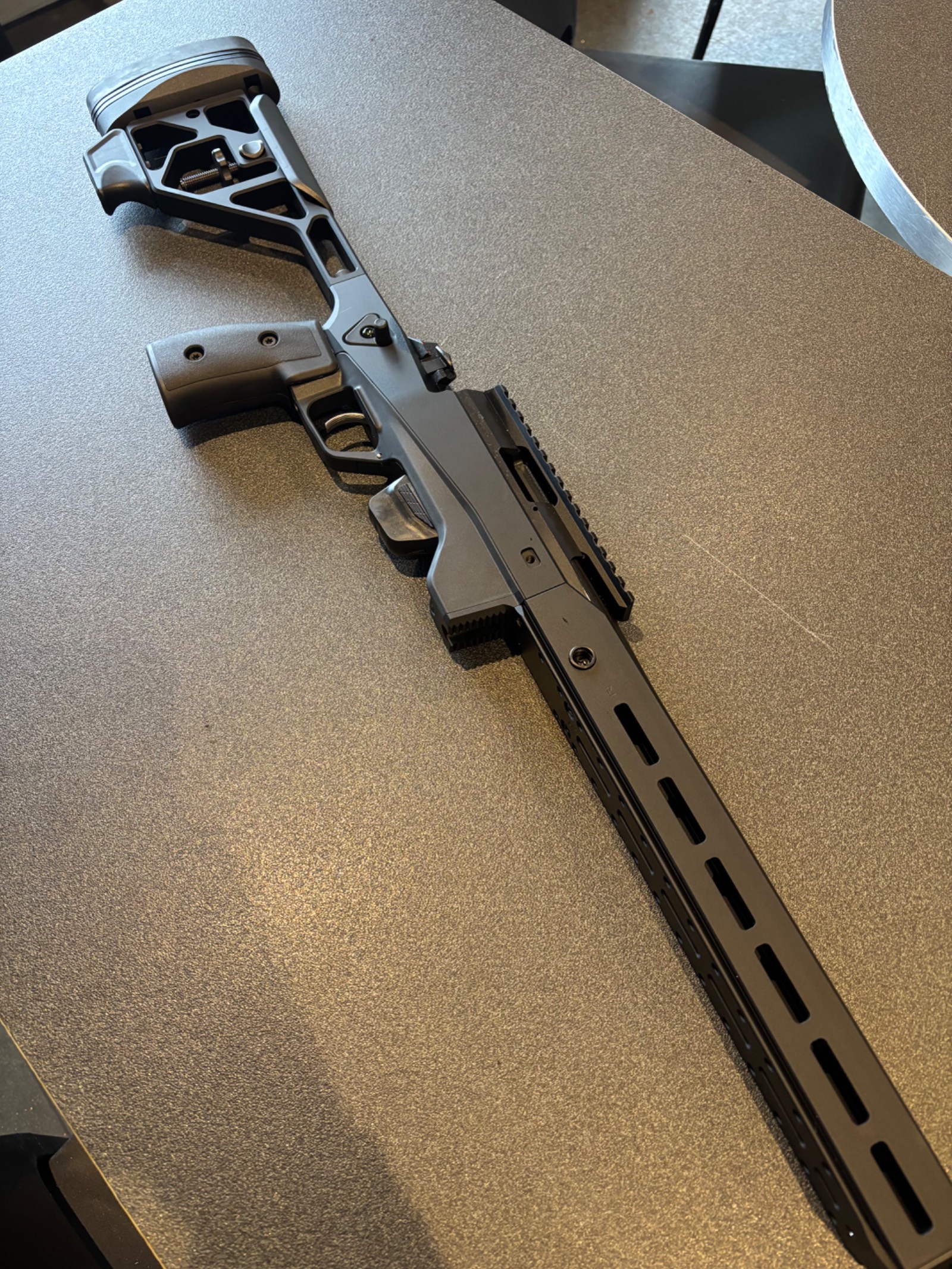New tikka ace target .22lr Black aluminium chassis Threaded 1/2 UNEF 20” barrel 3.7kg Single stage trigger Two positions safety Comes with additional 10rd mag