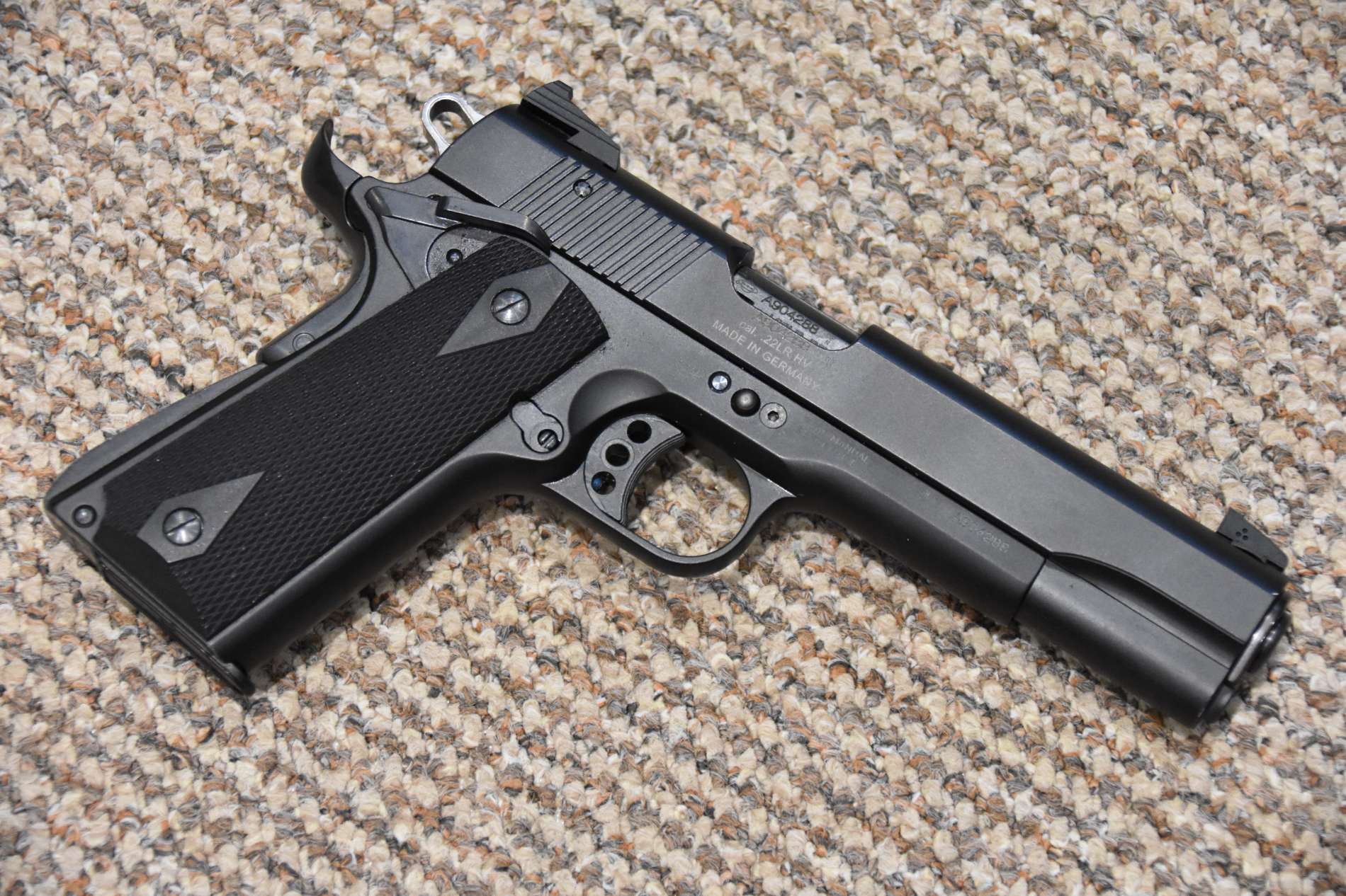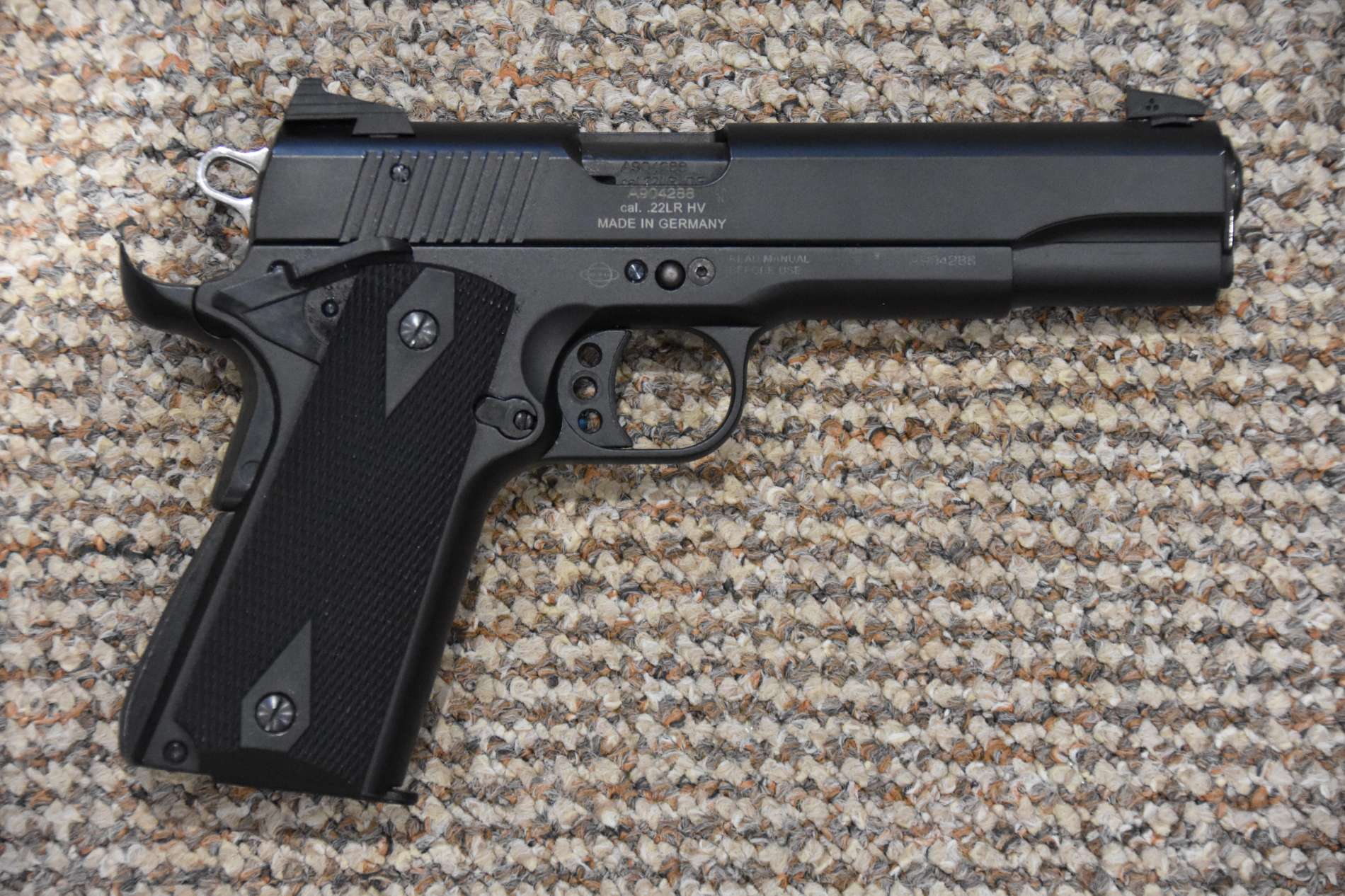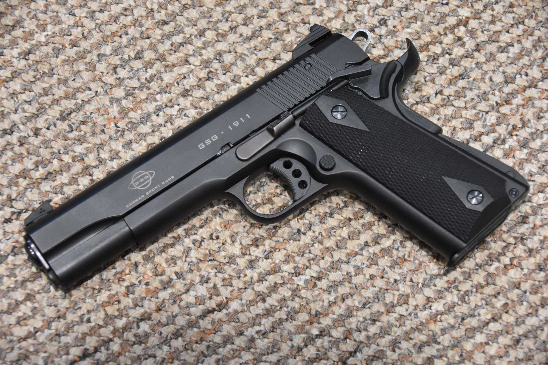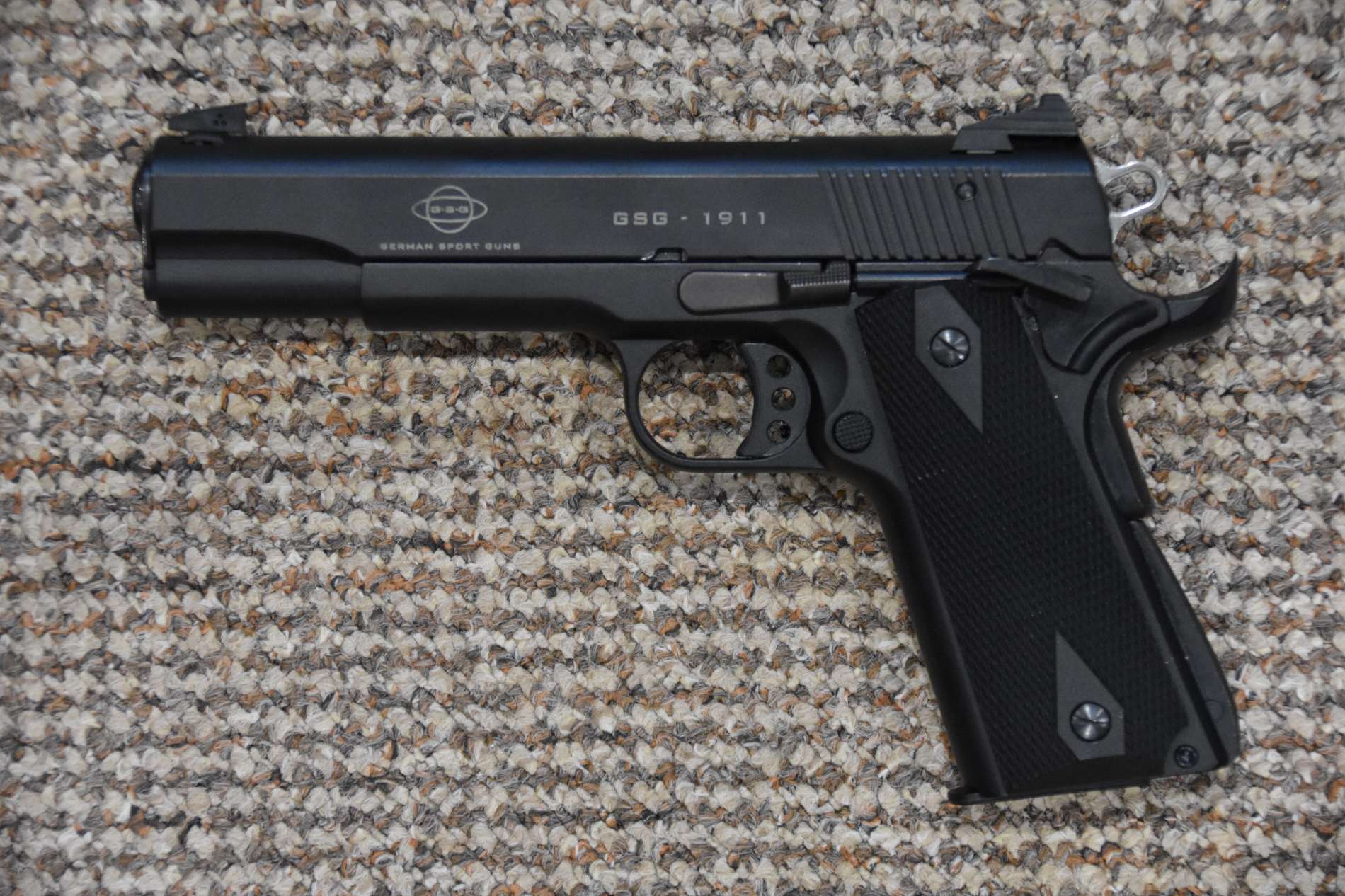 .22LR GSG 1911 Semi-+automatic pistol 5" Barrel 10 Round detachable magazine CNC machined aluminium alloy slide Beavertail grip safety Ambidextrous thumb safety catch Skeletonised trigger Removable grips Threaded barrel end '3 dot' sights Comes in GSG hard carry case £295 Finance Available