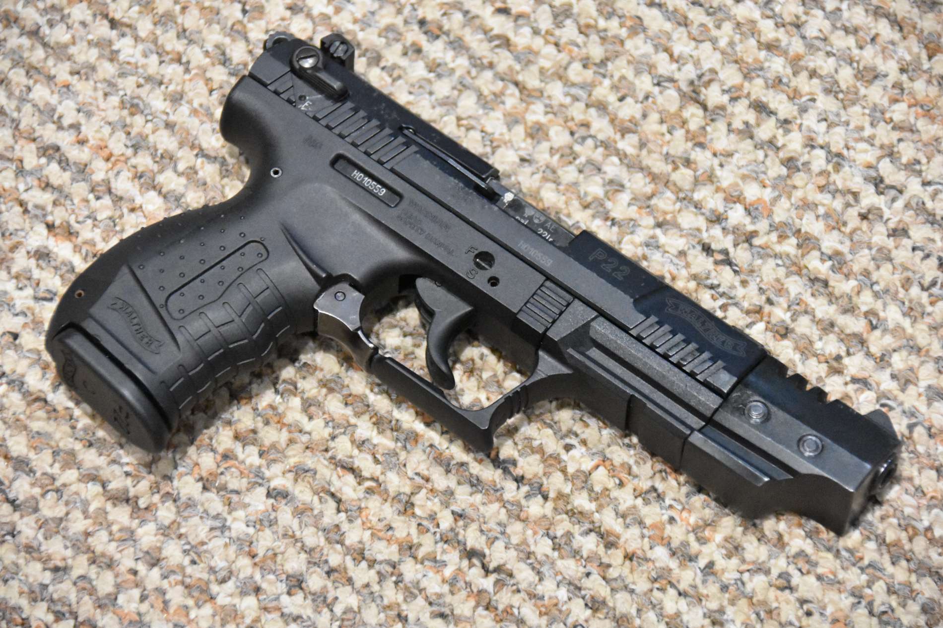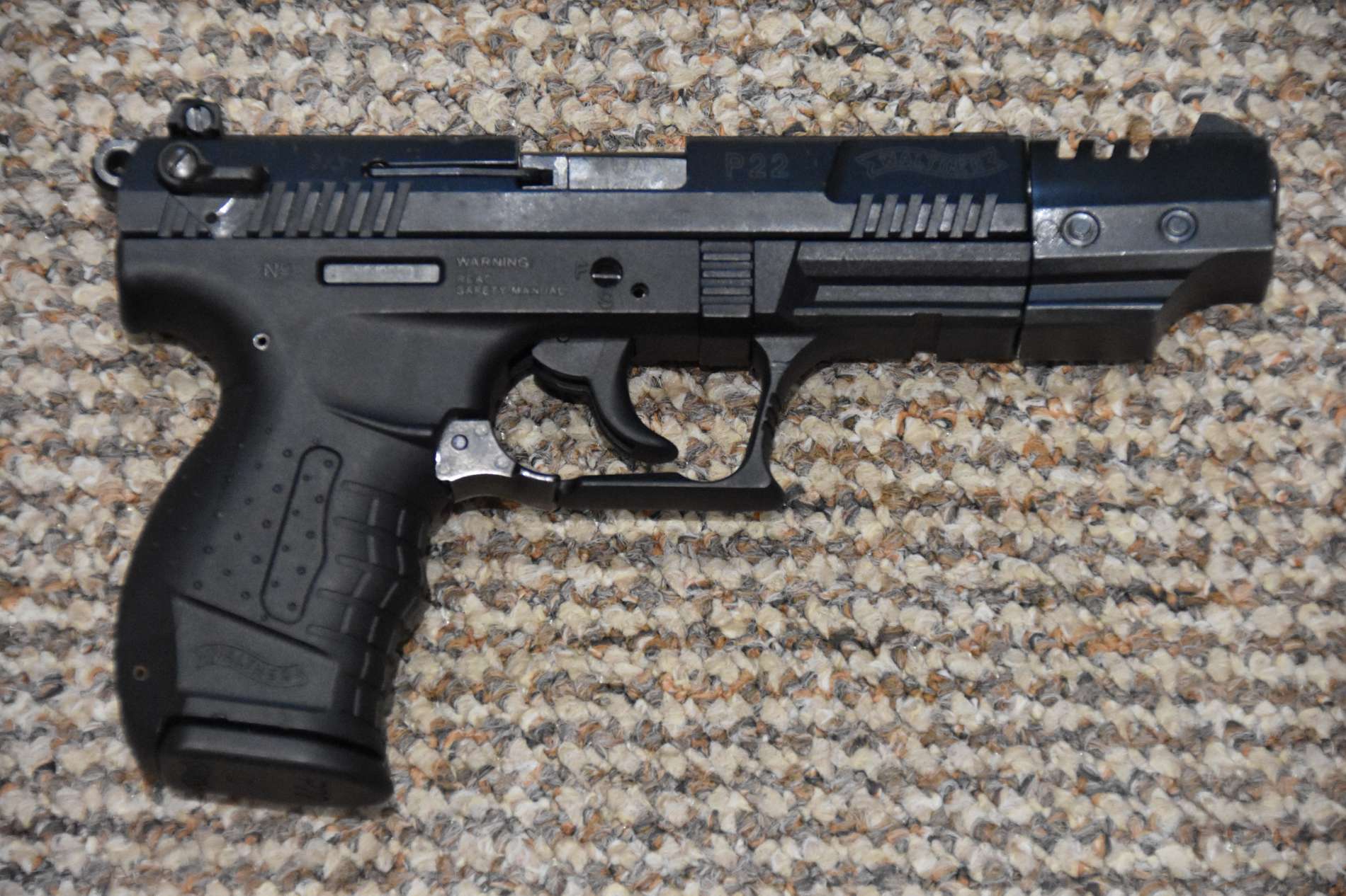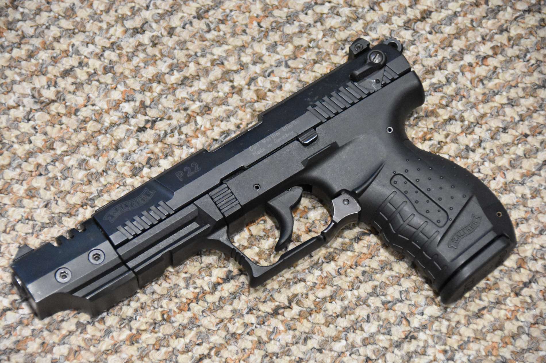 .22LR Walther P22 Target Semi-automatic pistol 5" Barrel 2 x 10 Round detachable magazines Ambidextrous magazine release Ambidextrous safety catch '3-DOT' iron sights Polymer body Clamp on target stabiliser Lower picatinny rail Comes in Walther hard carry case £295 Finance Available