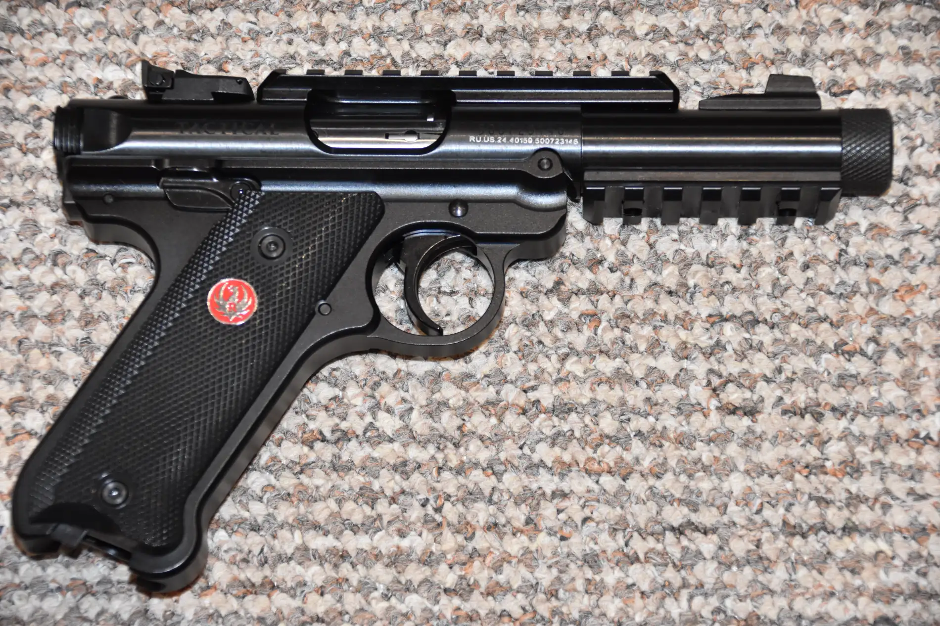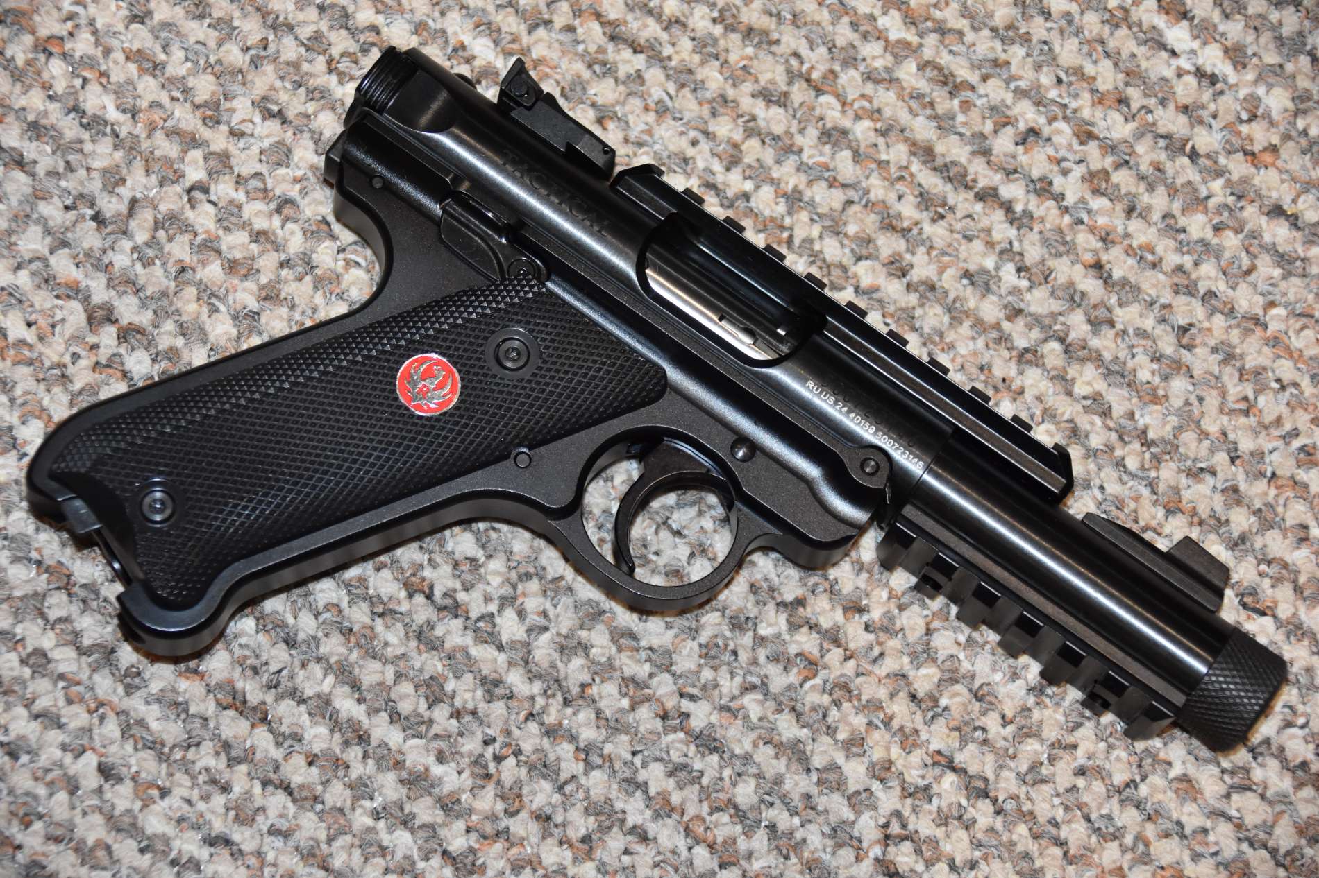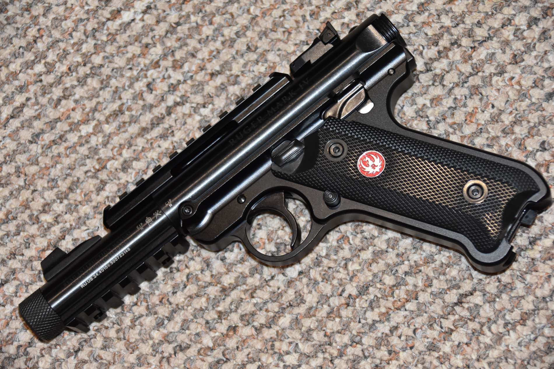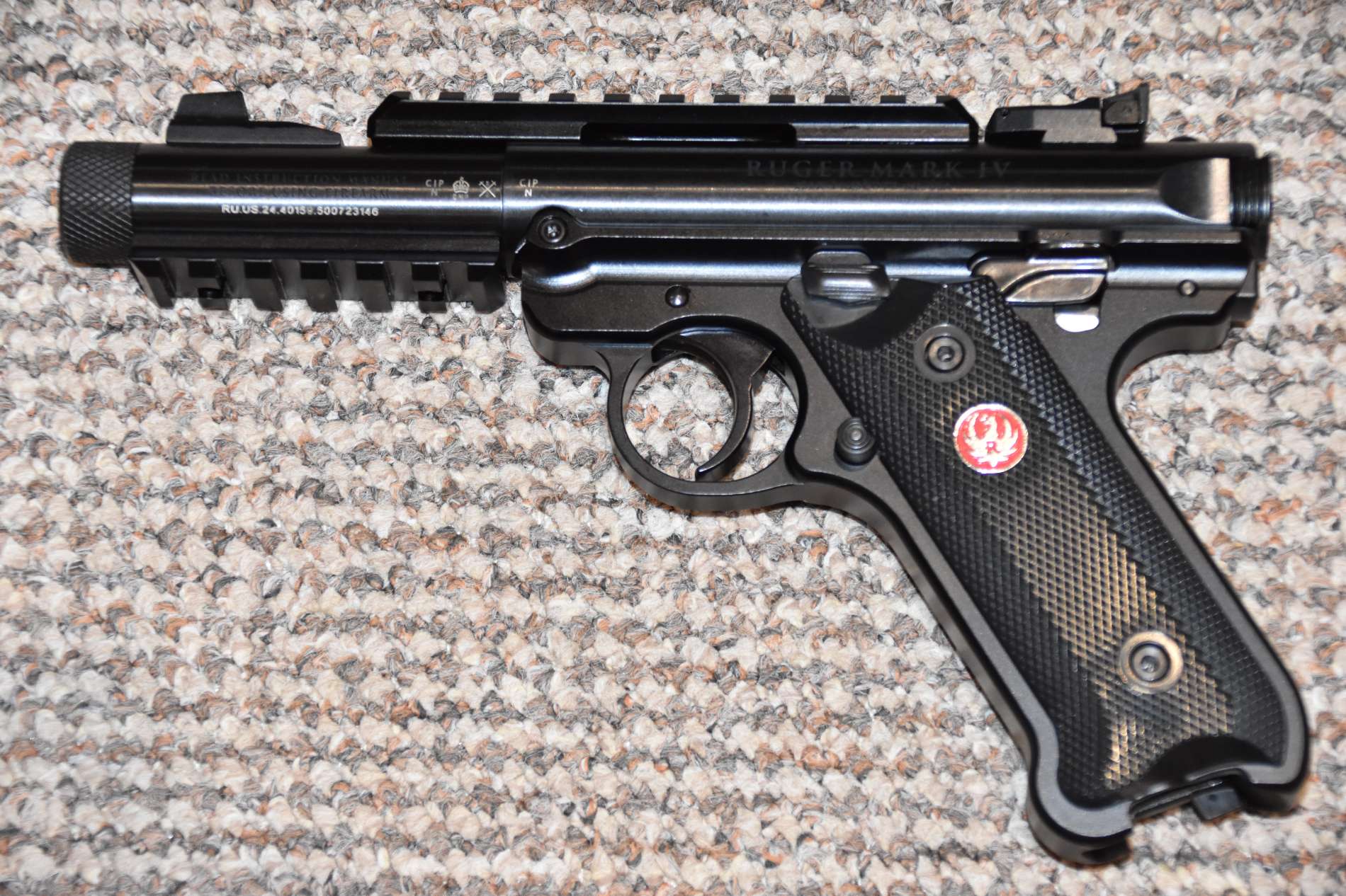 .22LR Ruger MK4 Tactical Semi-automatic pistol 2 x 10 round detachable magazines 4.4" Threaded barrel (1/2"X28UNEF) Adjustable rear sight Ambidextrous safety catch Full length picatinny top rail to allow the fitting of a red dot sight Bottom mounted picatinny rail Checkered Synthetic grips Blued finish Comes in hard Ruger carrying case BRAND NEW £895 Finance available.