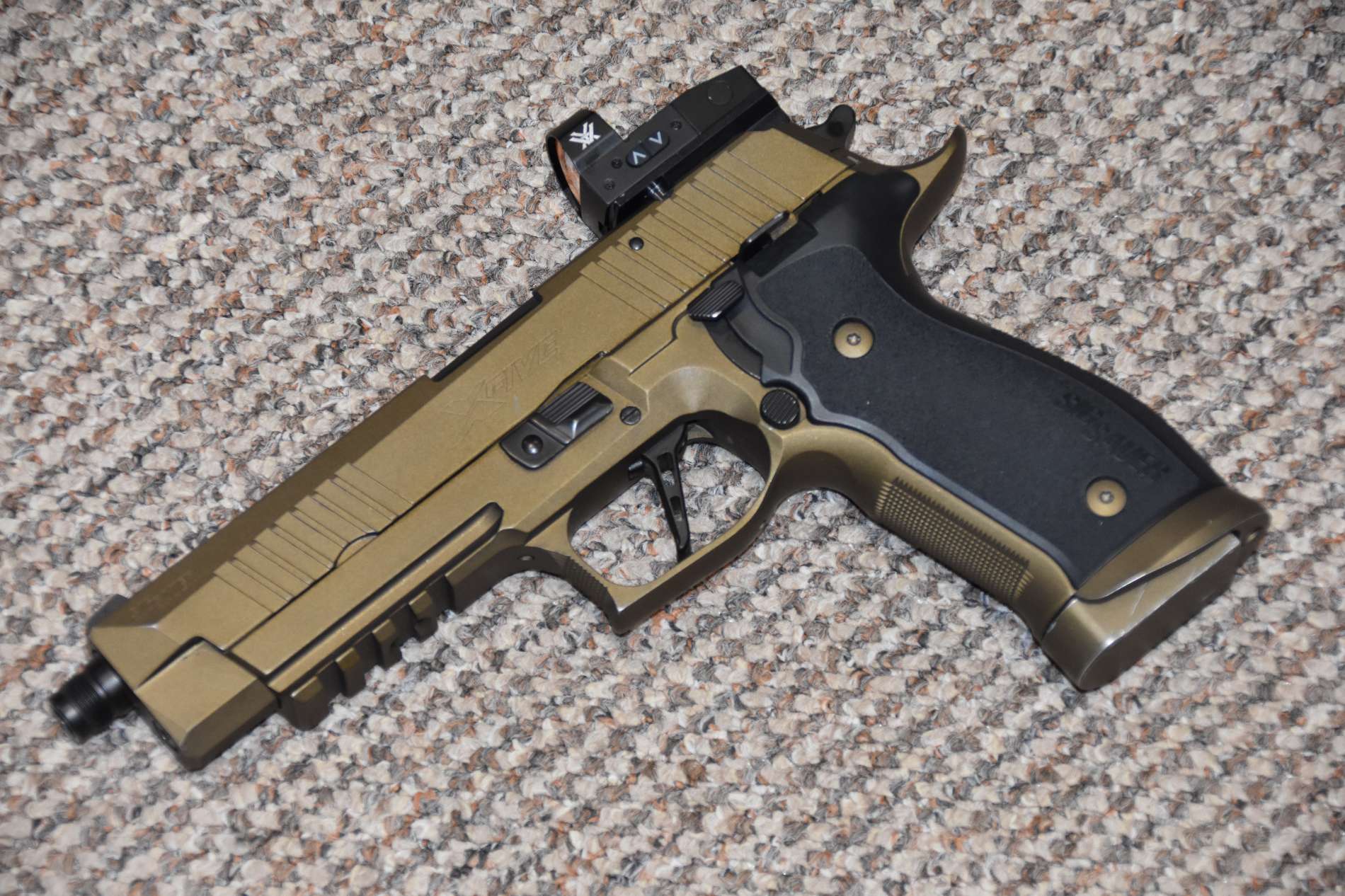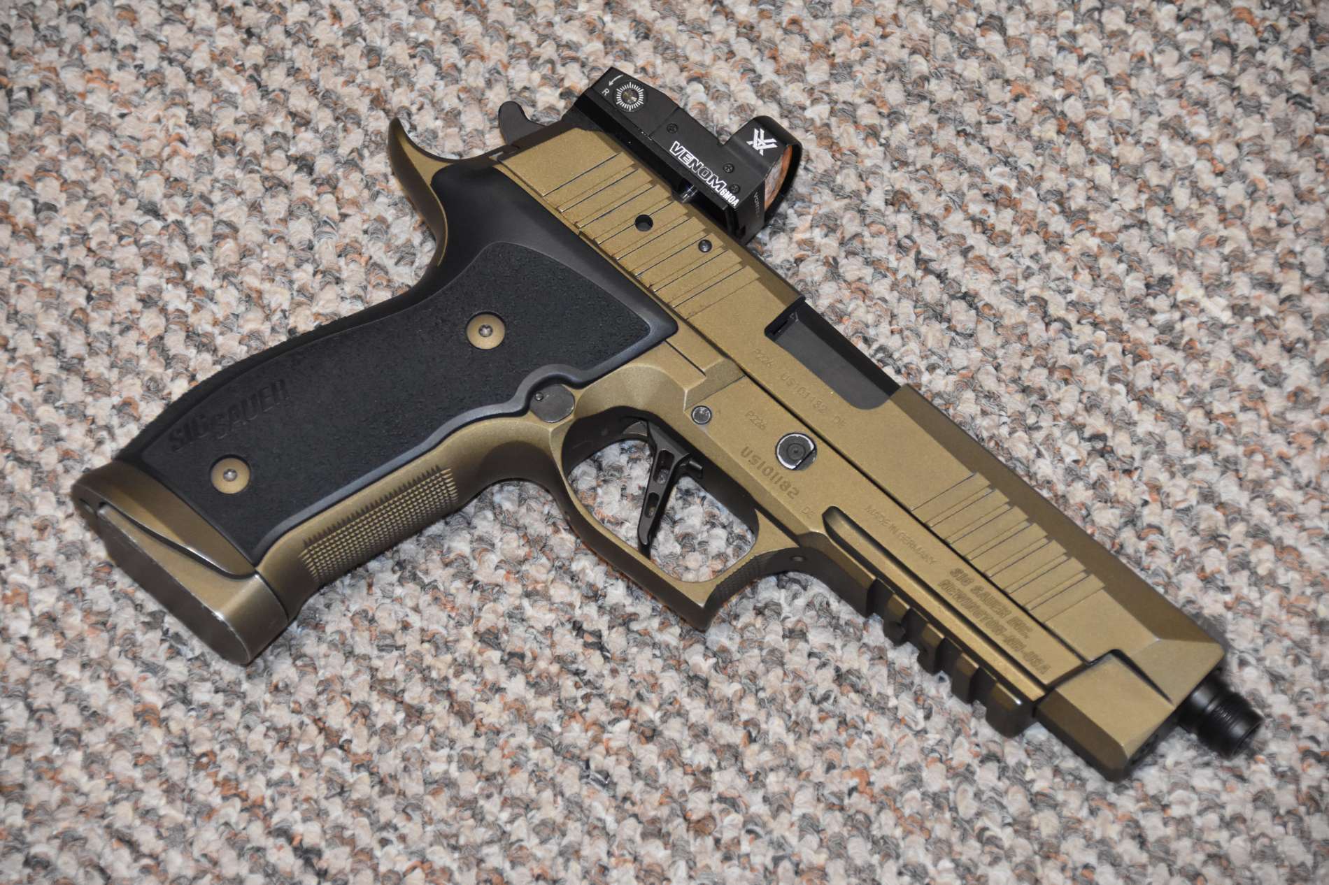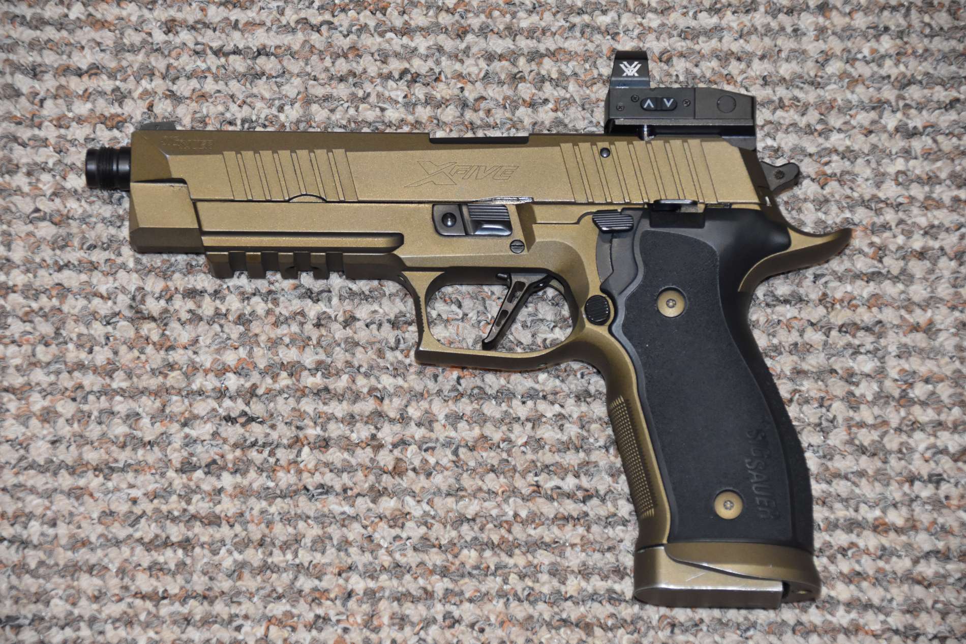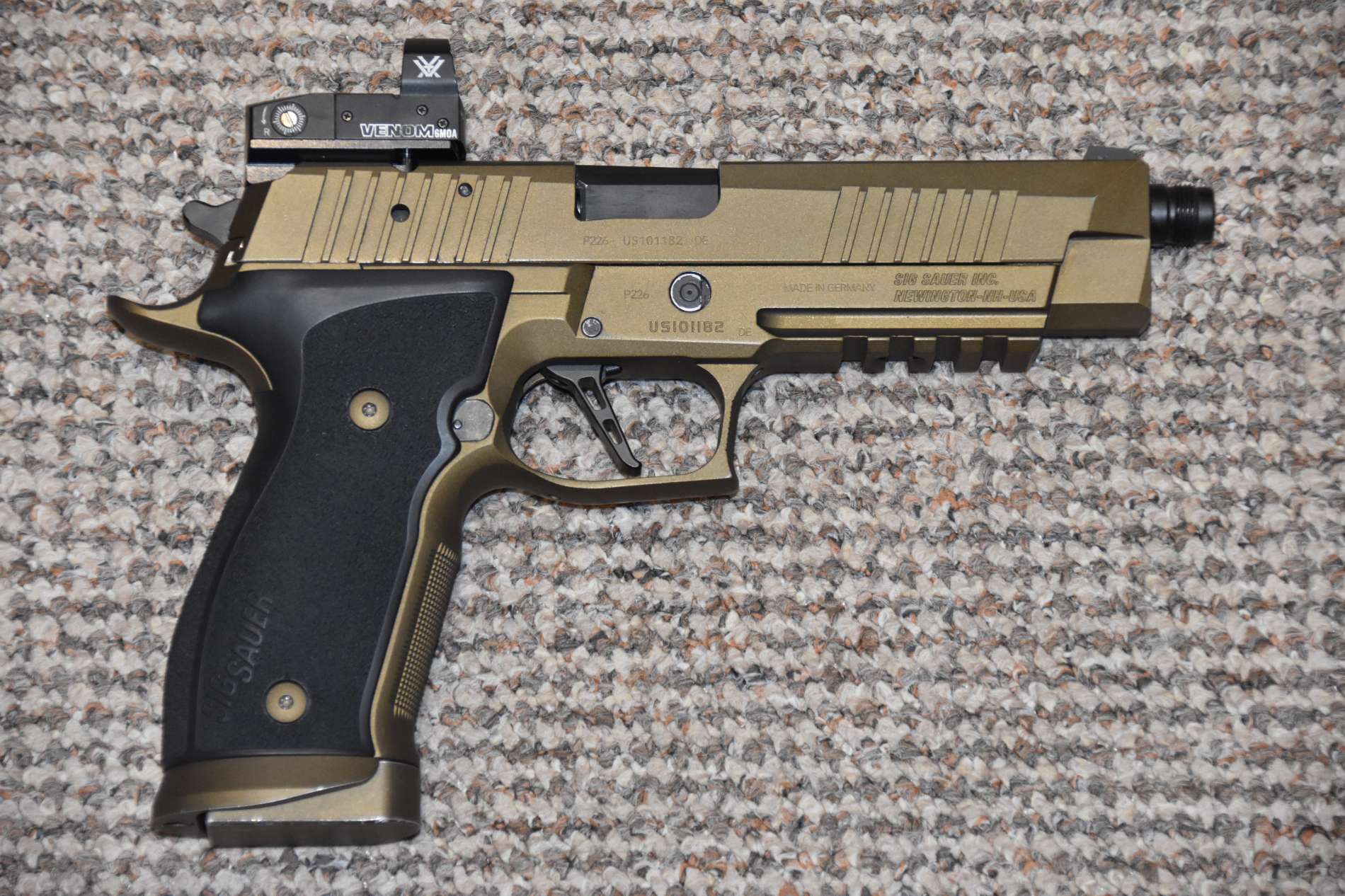 9mm Sig Sauer P226 X5 Semi automatic pistol 5.5" Barrel Coated in Bronze Cerakote Threaded barrel Sig Sauer grips 4 x Detachable magazines Lower picatinny accessory rail Vortex Venom 6MOA red dot sight Original iron sights supplied Flat blade trigger (Original curved also supplied) Comes in Sig Sauer hard carry case £1995 Finance Available