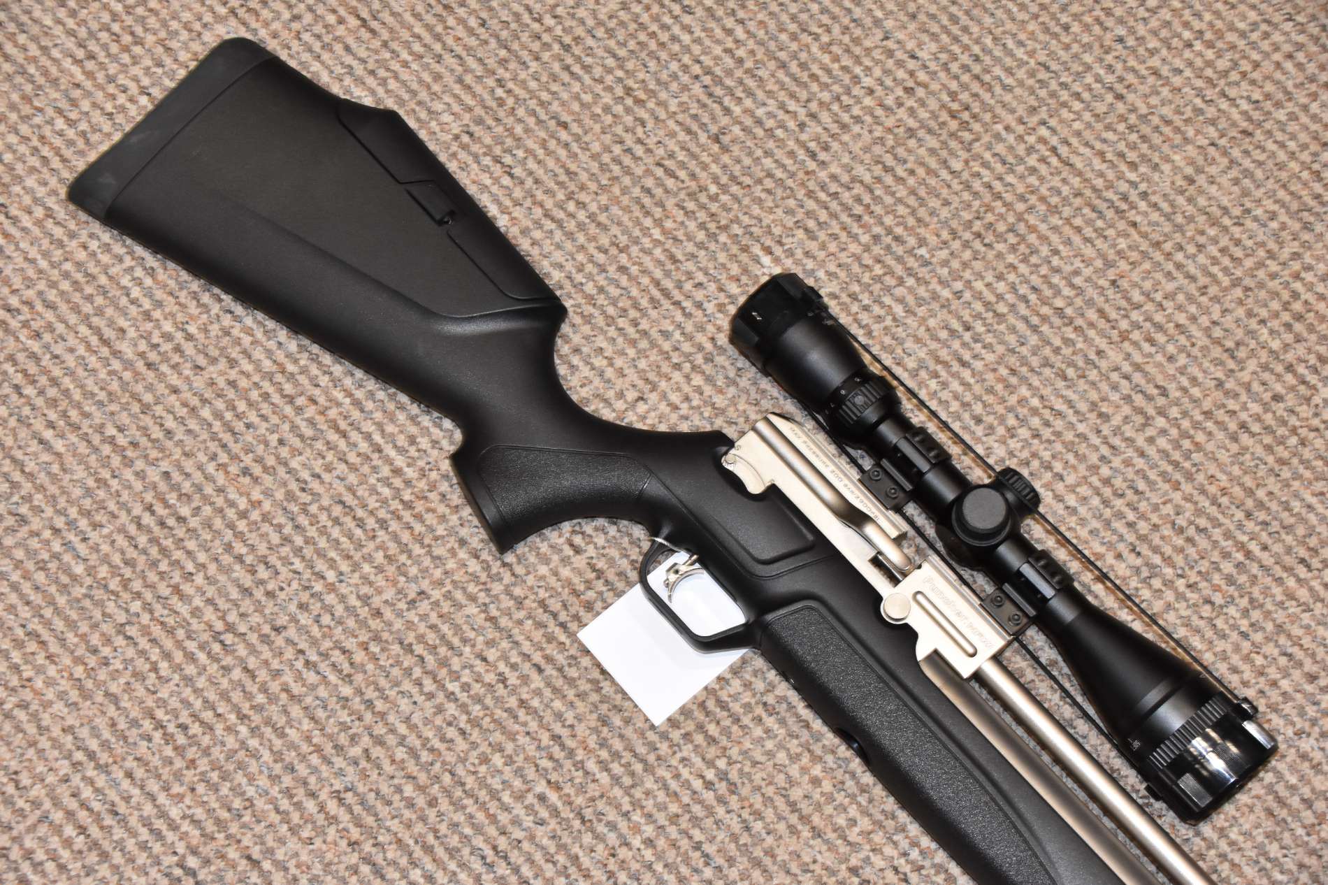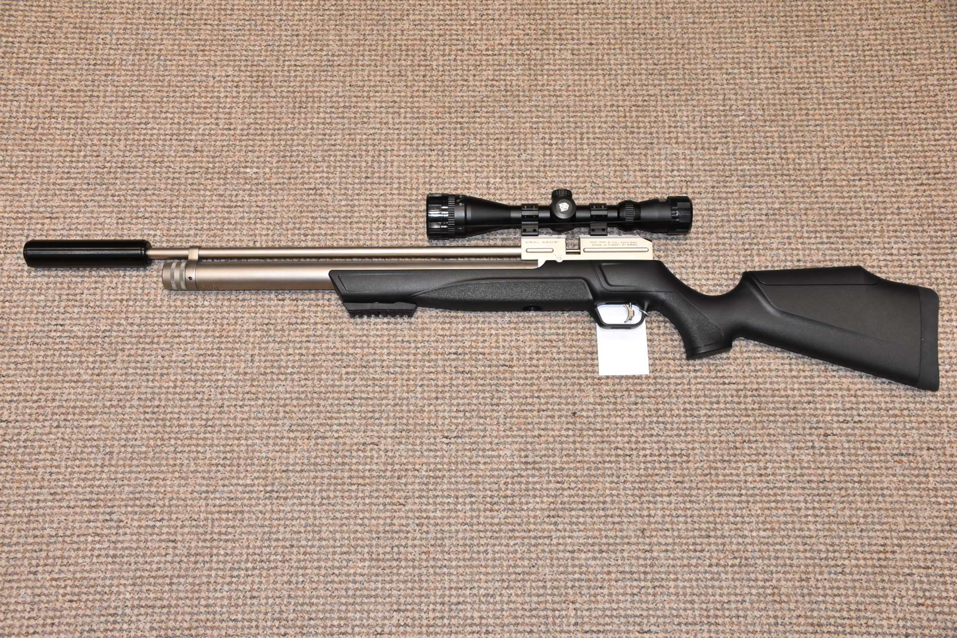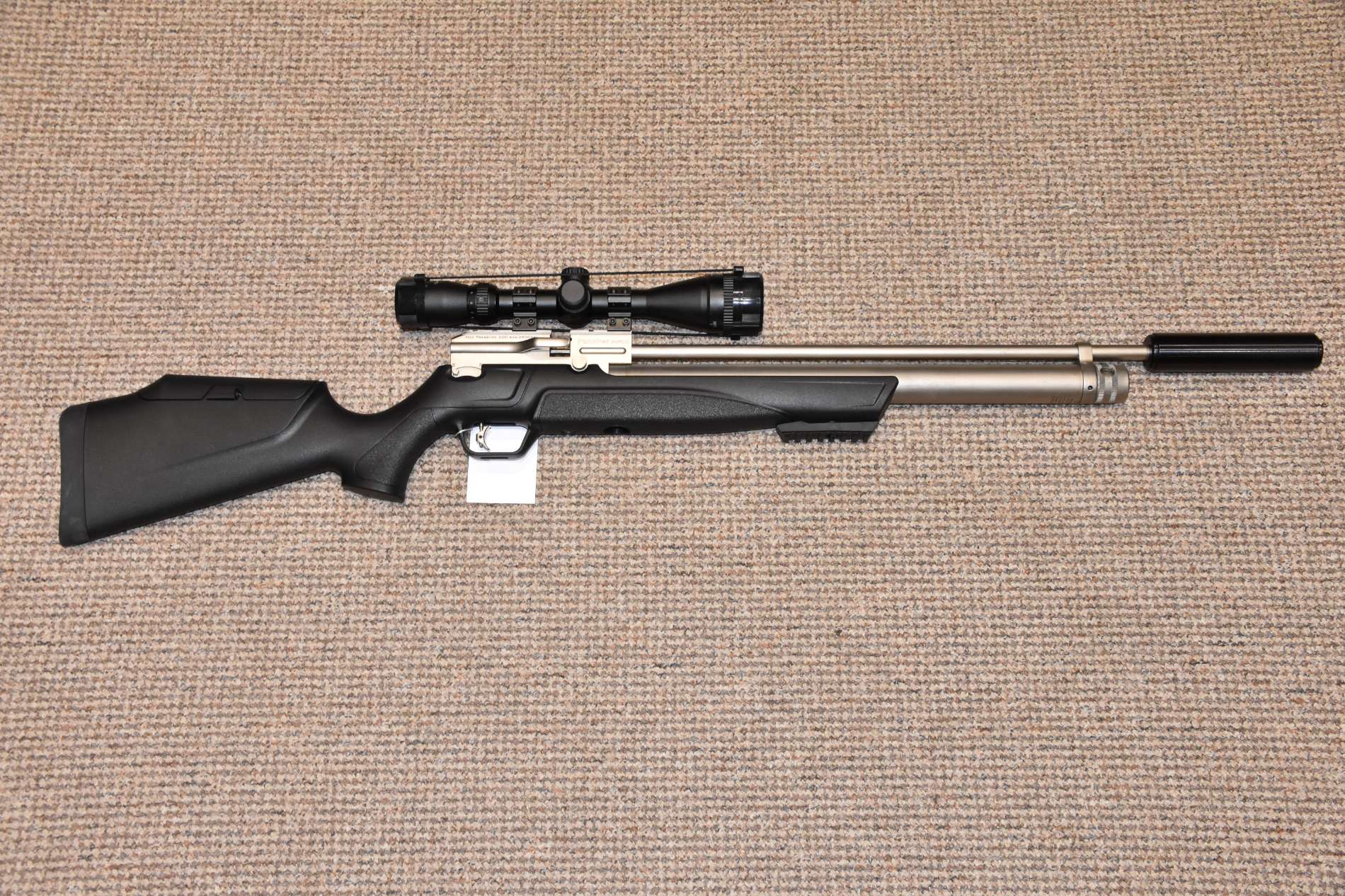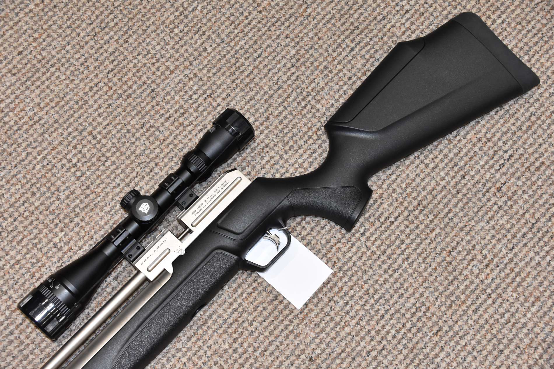 .22 Kral Puncher Maxi Precharged air rifle 500mm Barrel 2 Detachable rotary magazines SAK Sound moderator Nikkostirling Mountmaster 3-9x40 illuminated scope Side cocking lever Adjustable comb Lower picatinny accessory rail Picatinny/dovetail scope rail Synthetic stock £395 including scope and moderator Finance Available