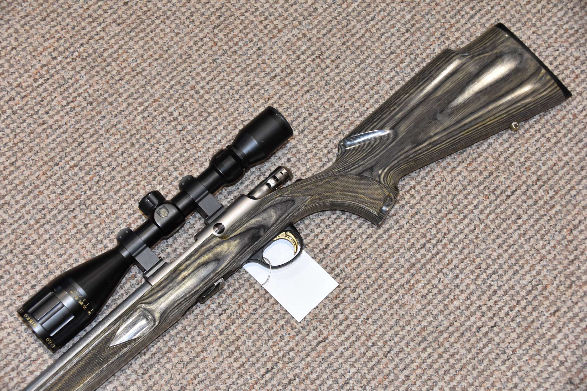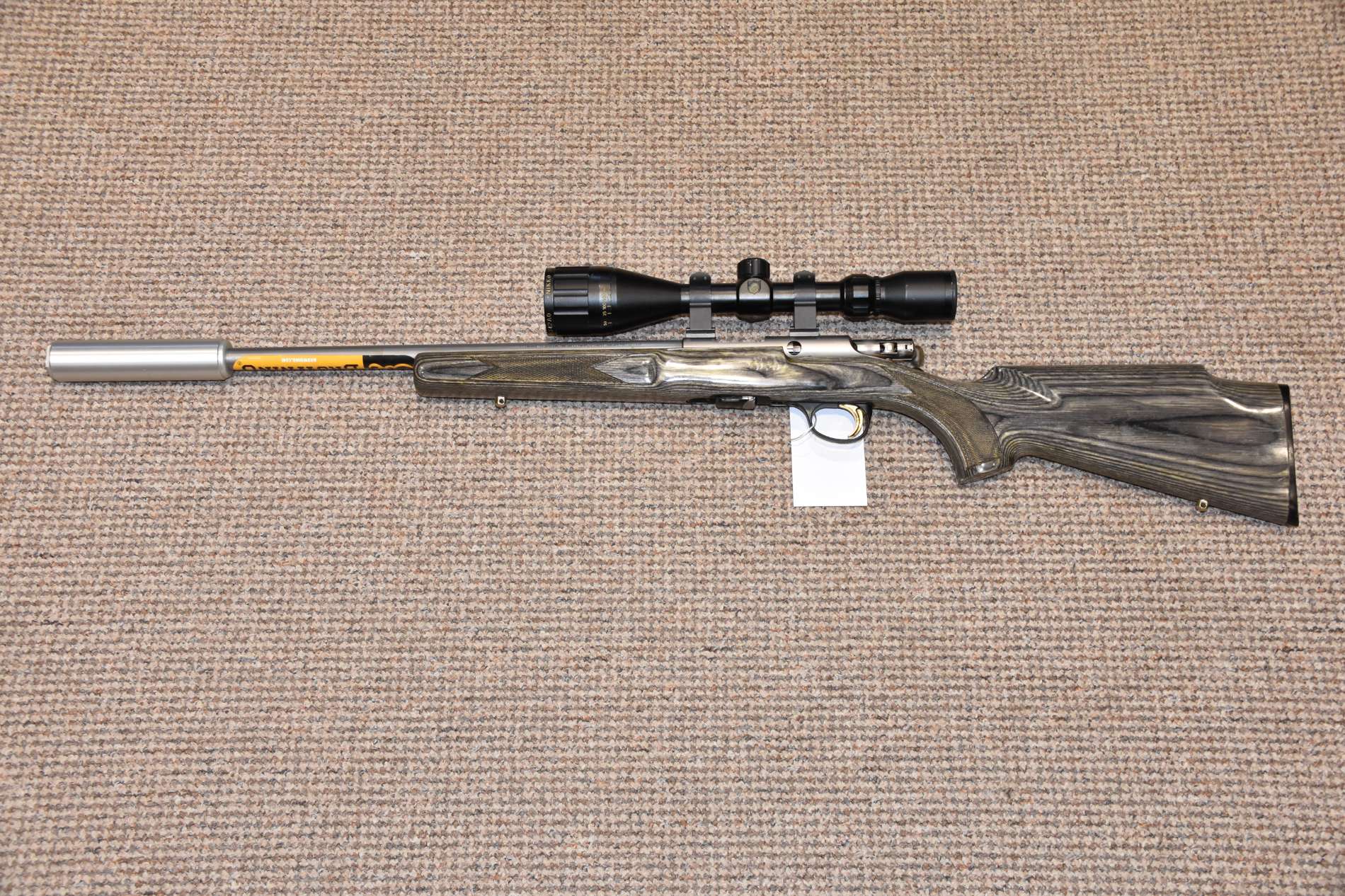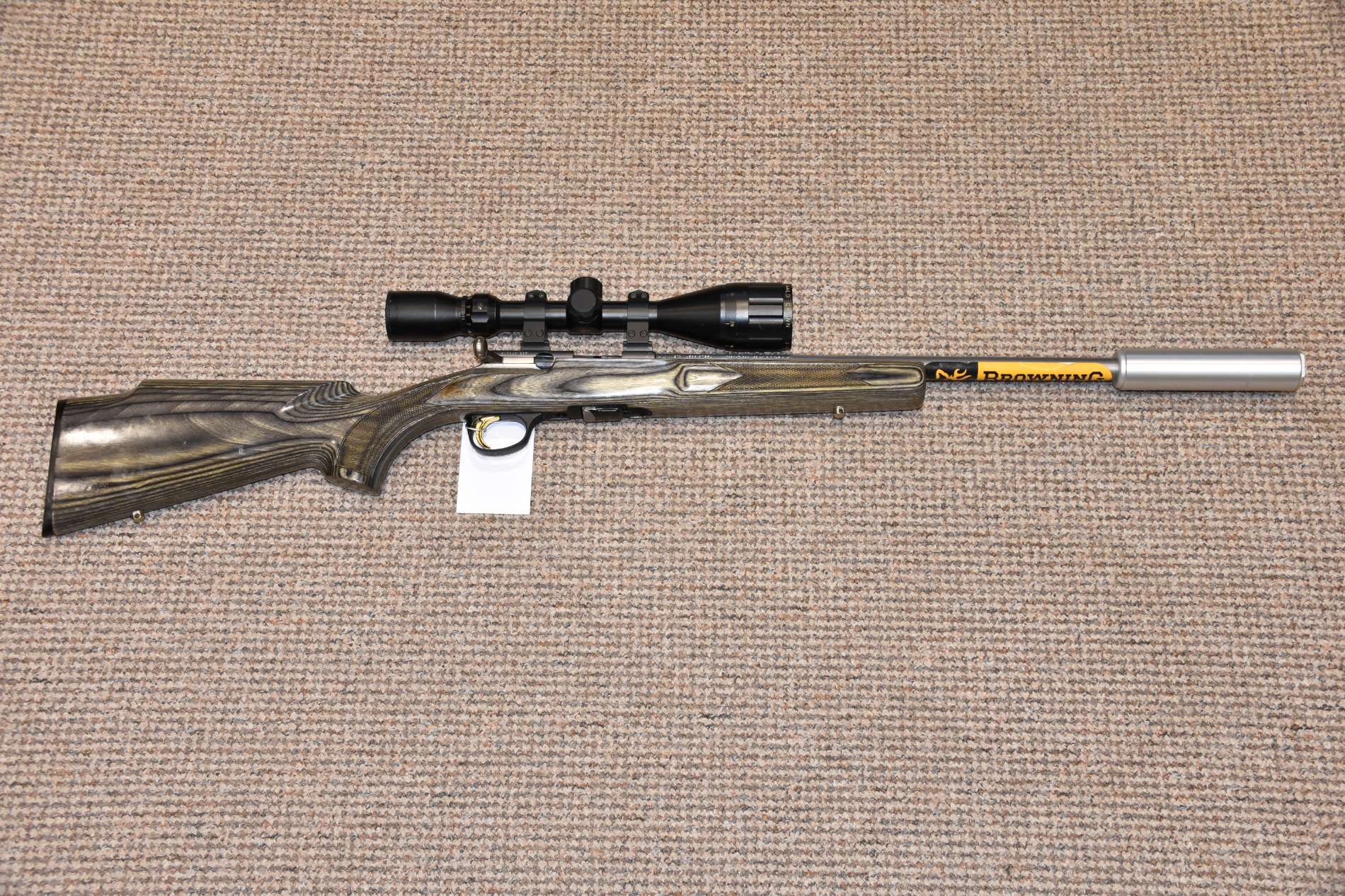 .22LR Browning T-Bolt Laminate Straight Pull Rifle 16" Barrel Nikkostirling Gold Crown 3-9x42 Scope SAK Stainless moderator 10 Round detachable magazine Sling studs Stainless barrel £450 including scope and moderator Finance Available