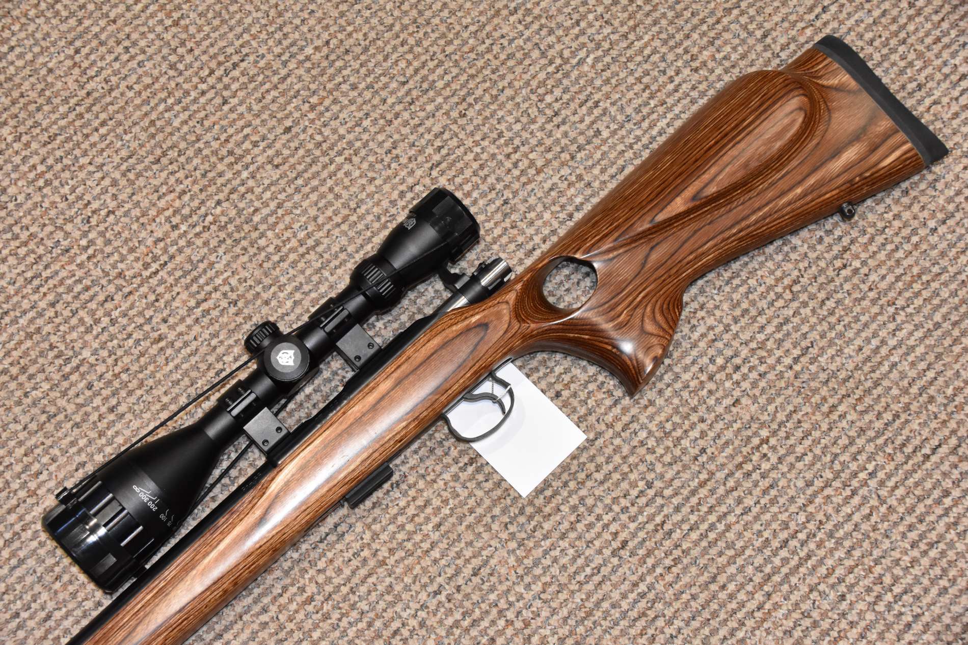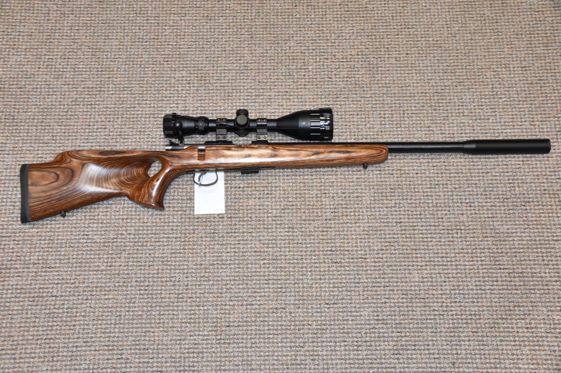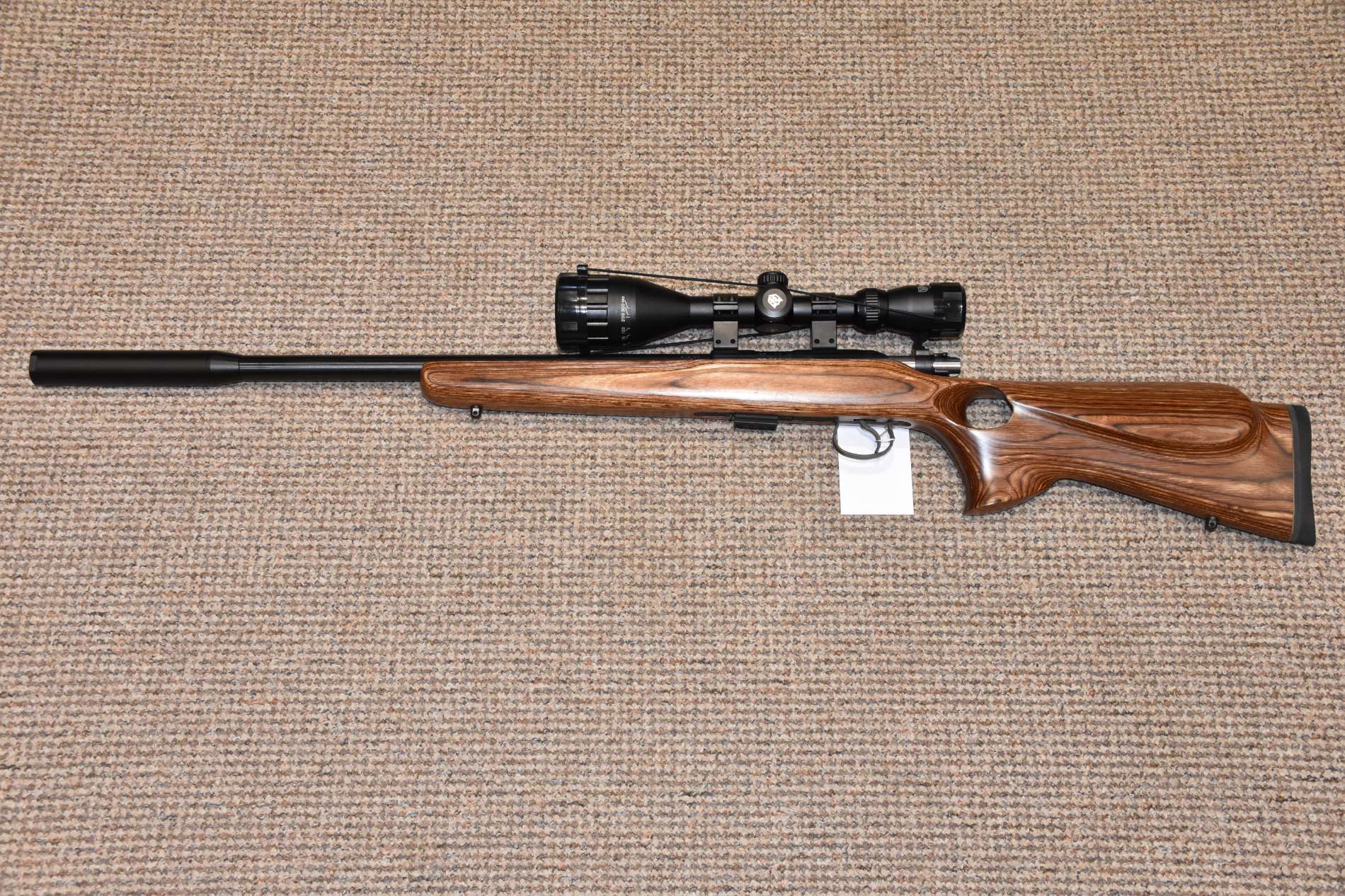 .22LR CZ 455 Thumbhole Varmint Bolt action rifle 16" Varmint barrel 5 Round detachable magazine Nikkostirling Mountmaster 4-12x50 illuminated scope Scirocco sound moderator Thumbhole laminate stock Sling studs £450 including scope and moderator Finance Available