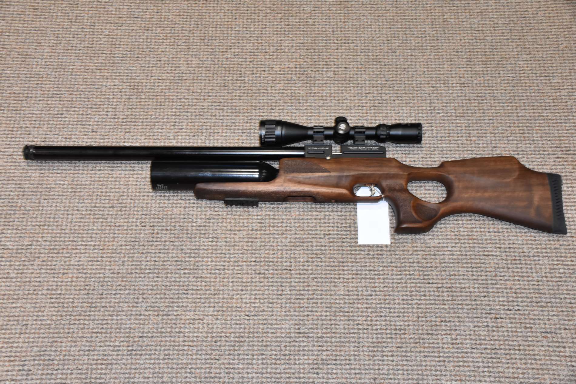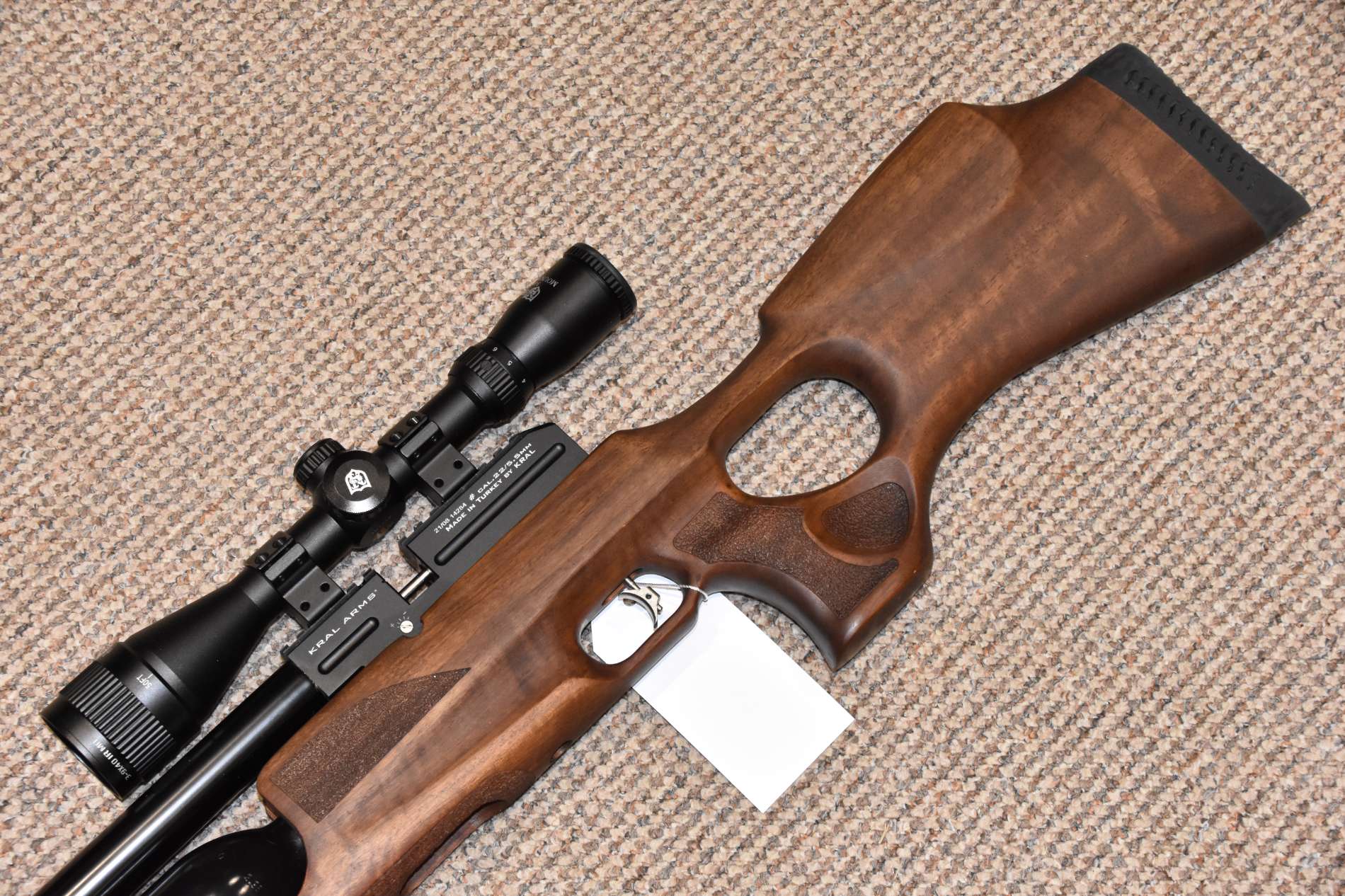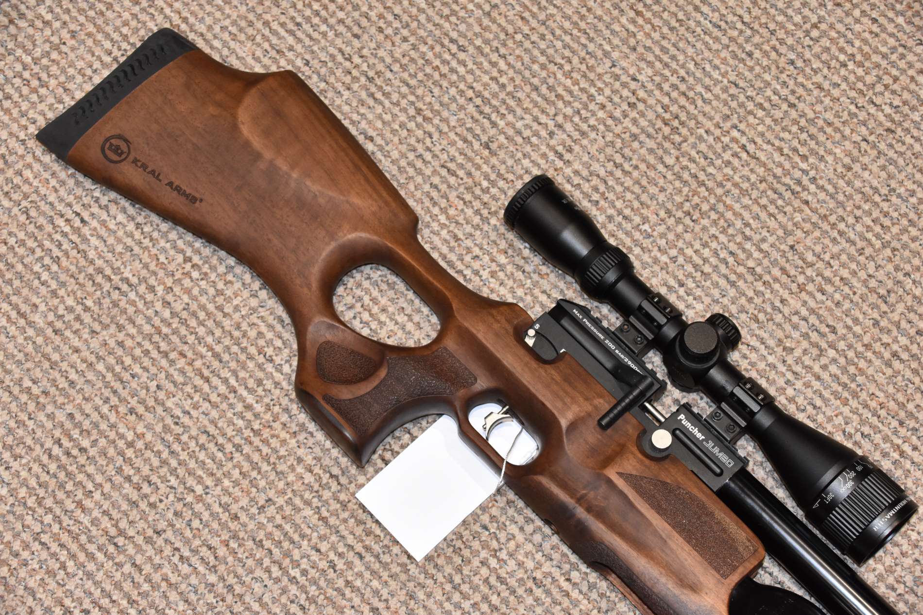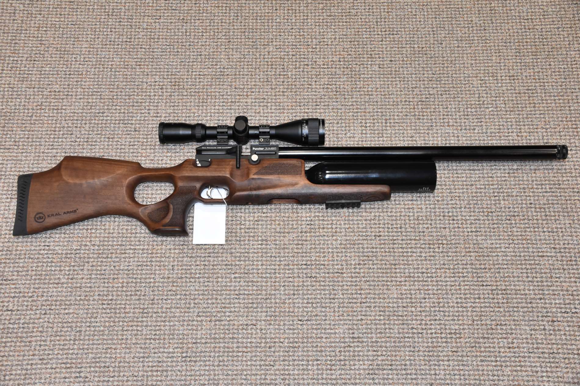 .22 Kral Puncher Jumbo Pre charged air rifle 600mm Barrel Nikkostirling Mountmaster 3-9x40 illuminated scope Threaded for moderator 2 Piece scope mounts Adjustable power - up to 35 ft/lbs 2 x 12 Shot detachable rotary magazines Lower picatinny accessory rail Thumbhole Turkish walnut stock Side cocking lever Adjustable trigger position £450 including scope Finance Available