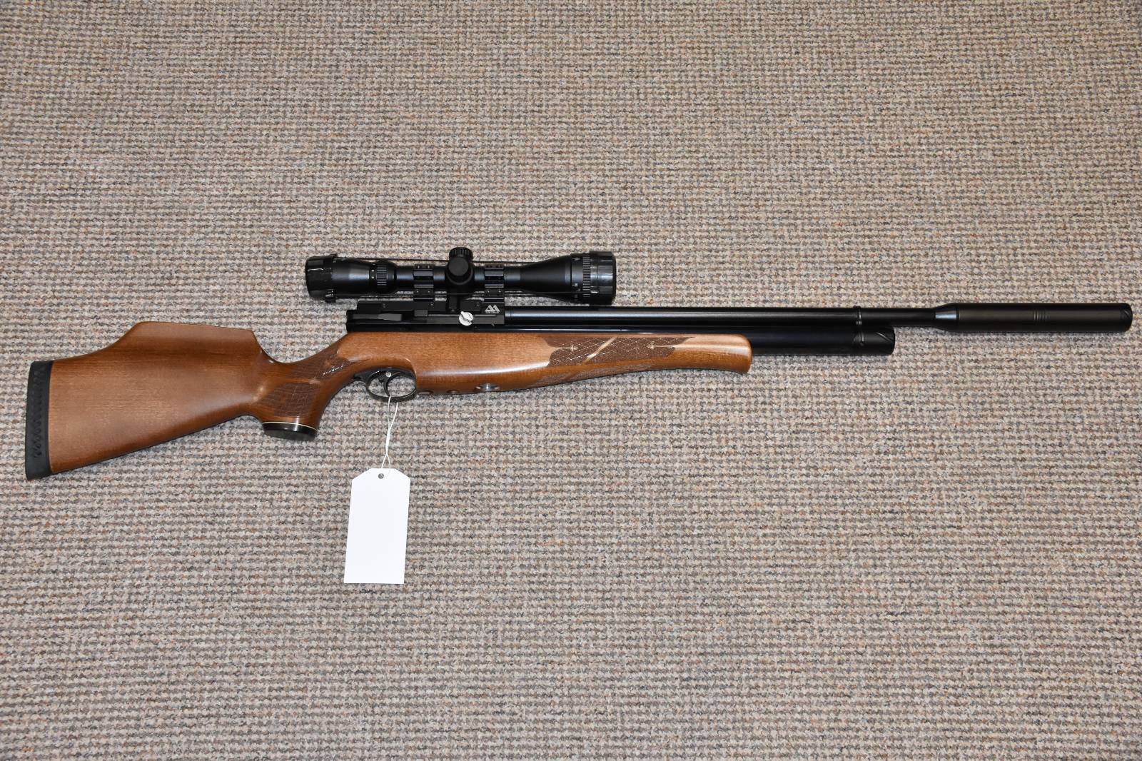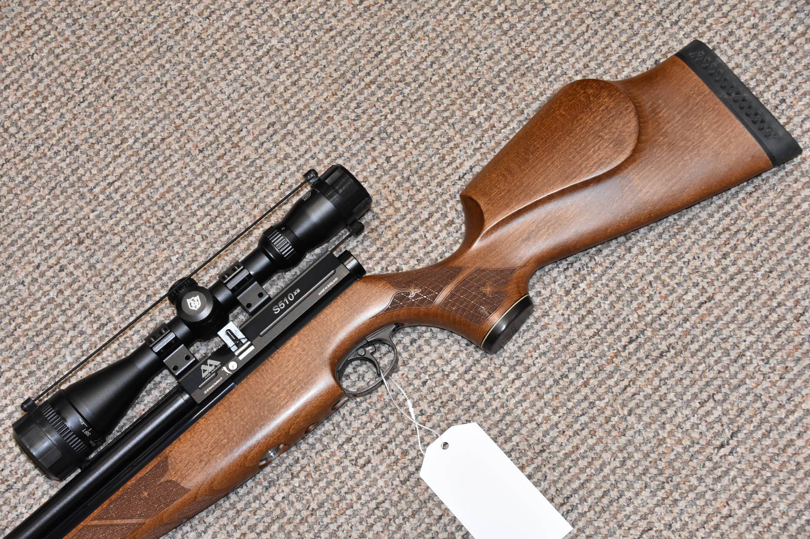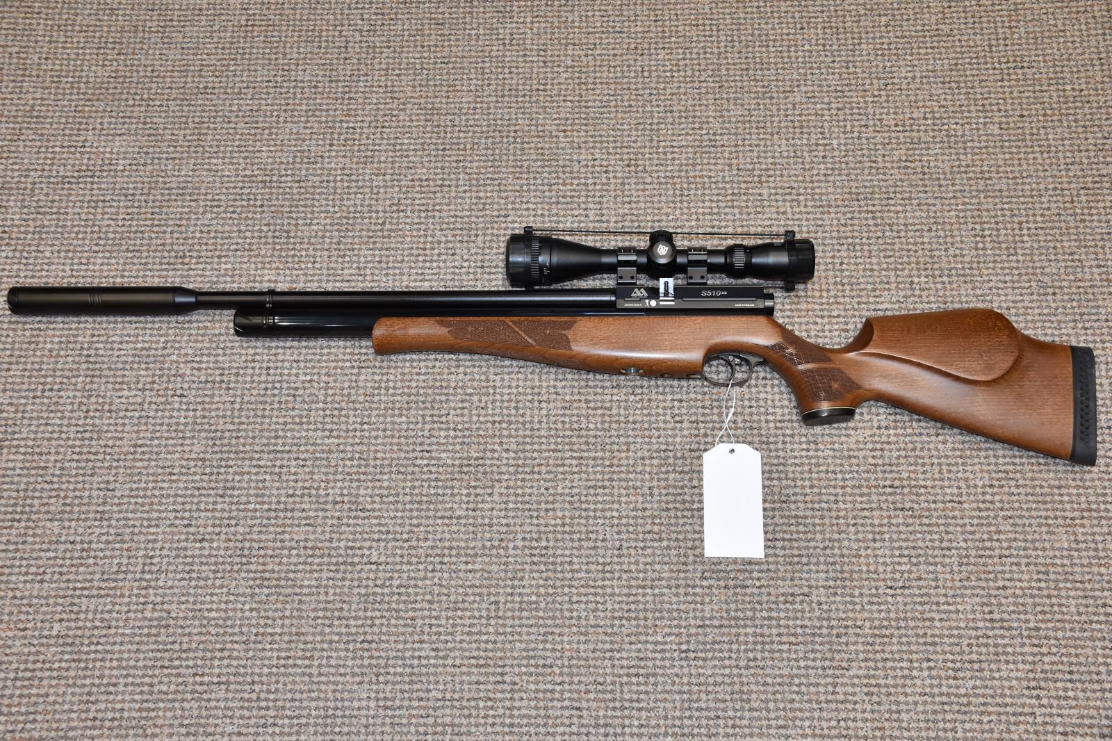 .22 Air Arms S510 XS FAC Pre Charged Air Rifle 15.5" barrel Nikkostirling Mountmaster 3-9x40 illuminated scope Air Arms Q-Tec sound moderator Adjustable power Tested at 28 ft/lbs of power 10 shot detachable rotary magazine Quick fill probe Push button safety Wooden stock Rubber butt pad £695 including scope and moderator Finance Available