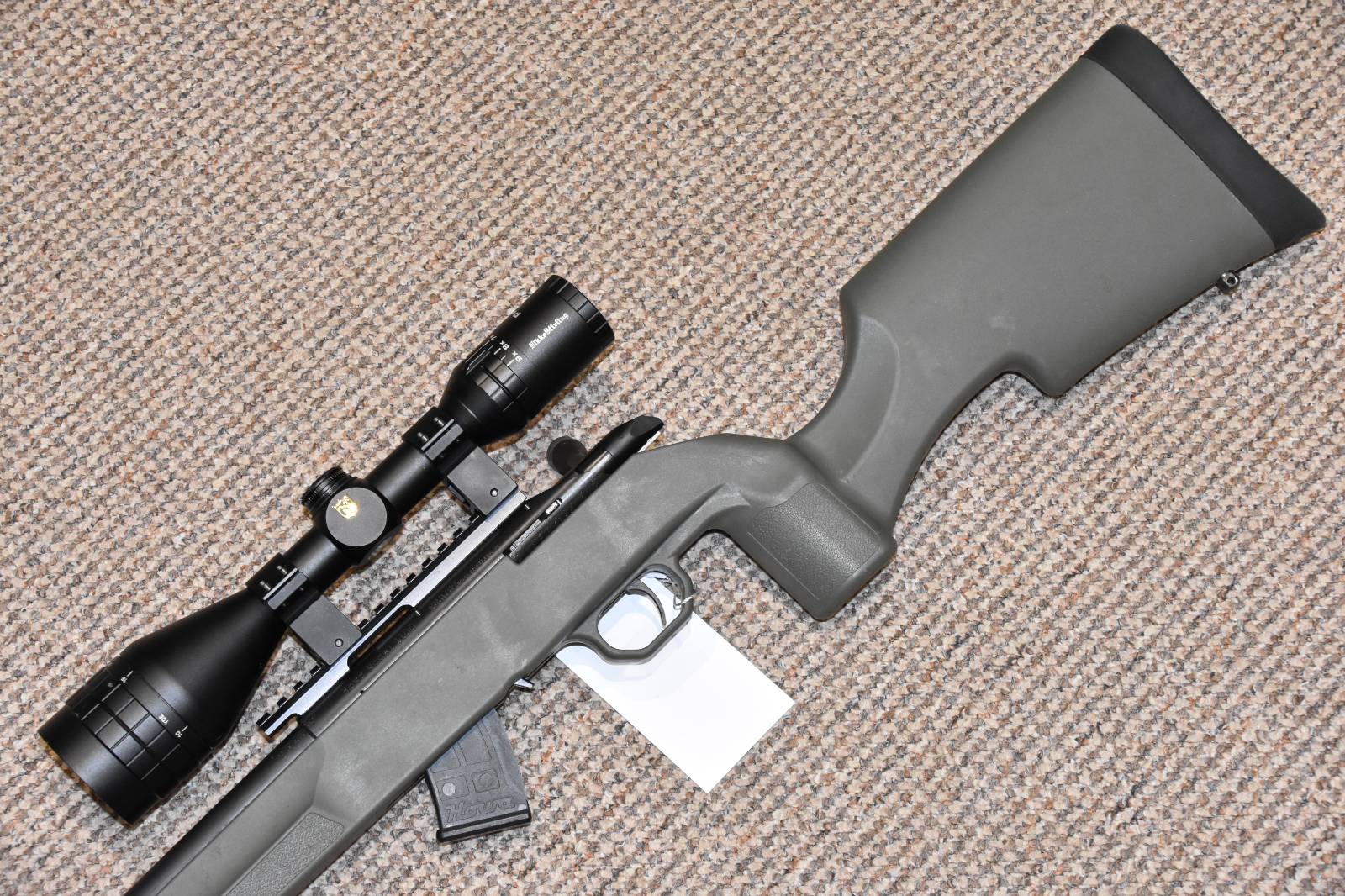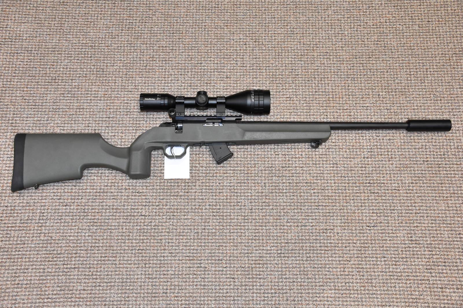 .22LR Howa 1100 Synthetic Bolt action rifle 16" barrel 10 Round detachable magazine Nikkostirling Panamax 3-9x50 scope RCC sound moderator Green synthetic stock M-Lok slotted fore end Sling studs Picatinny rail £395 including scope and moderator Finance Available